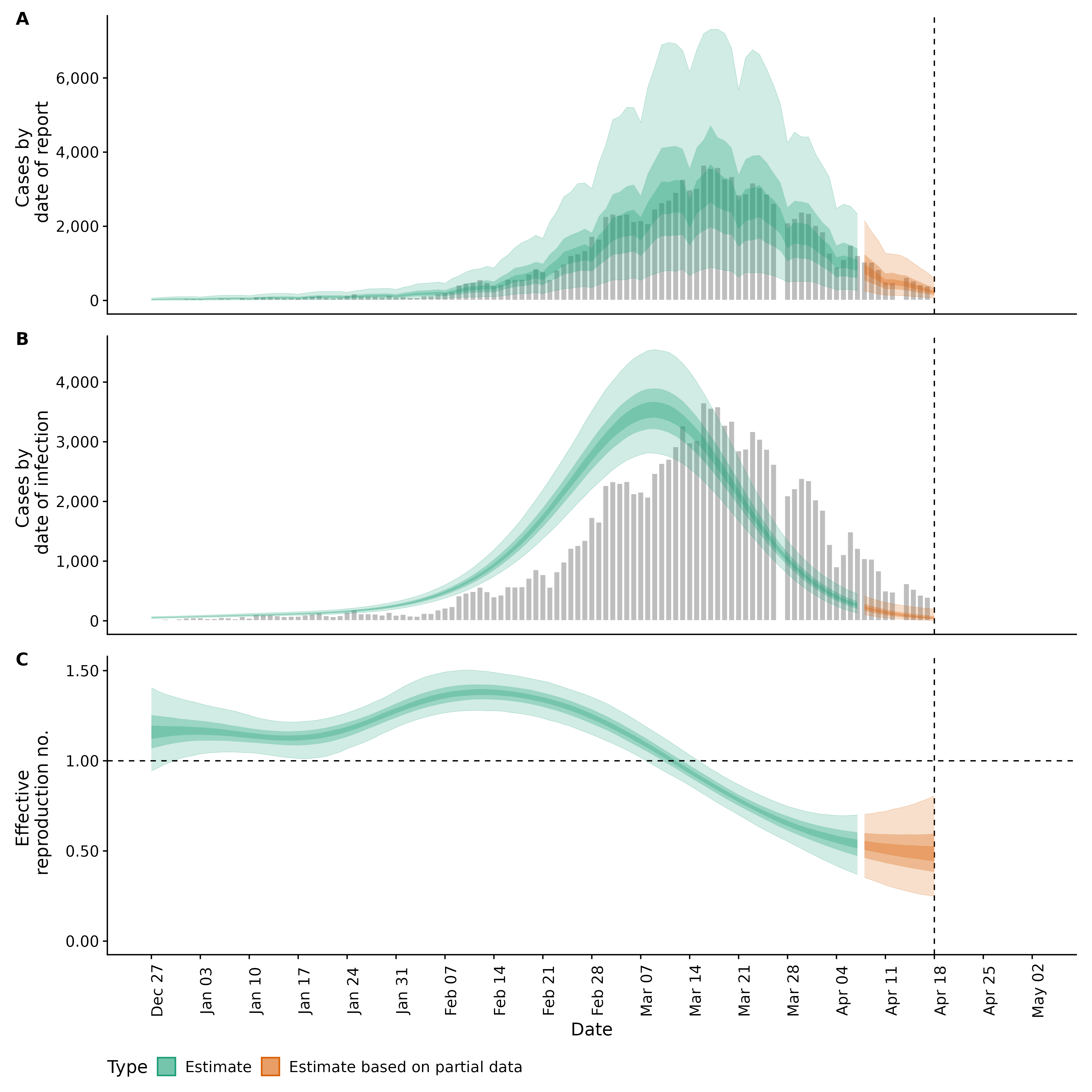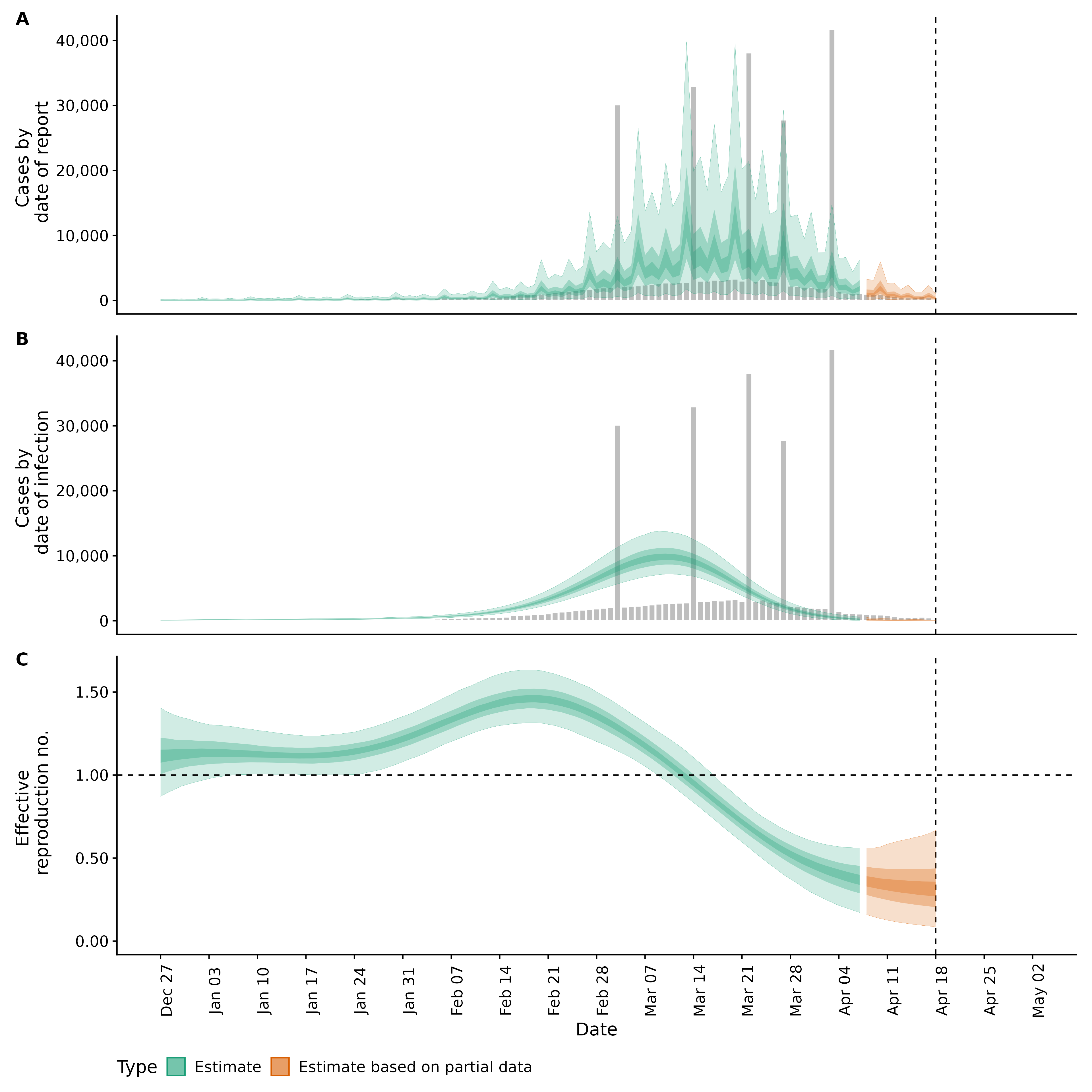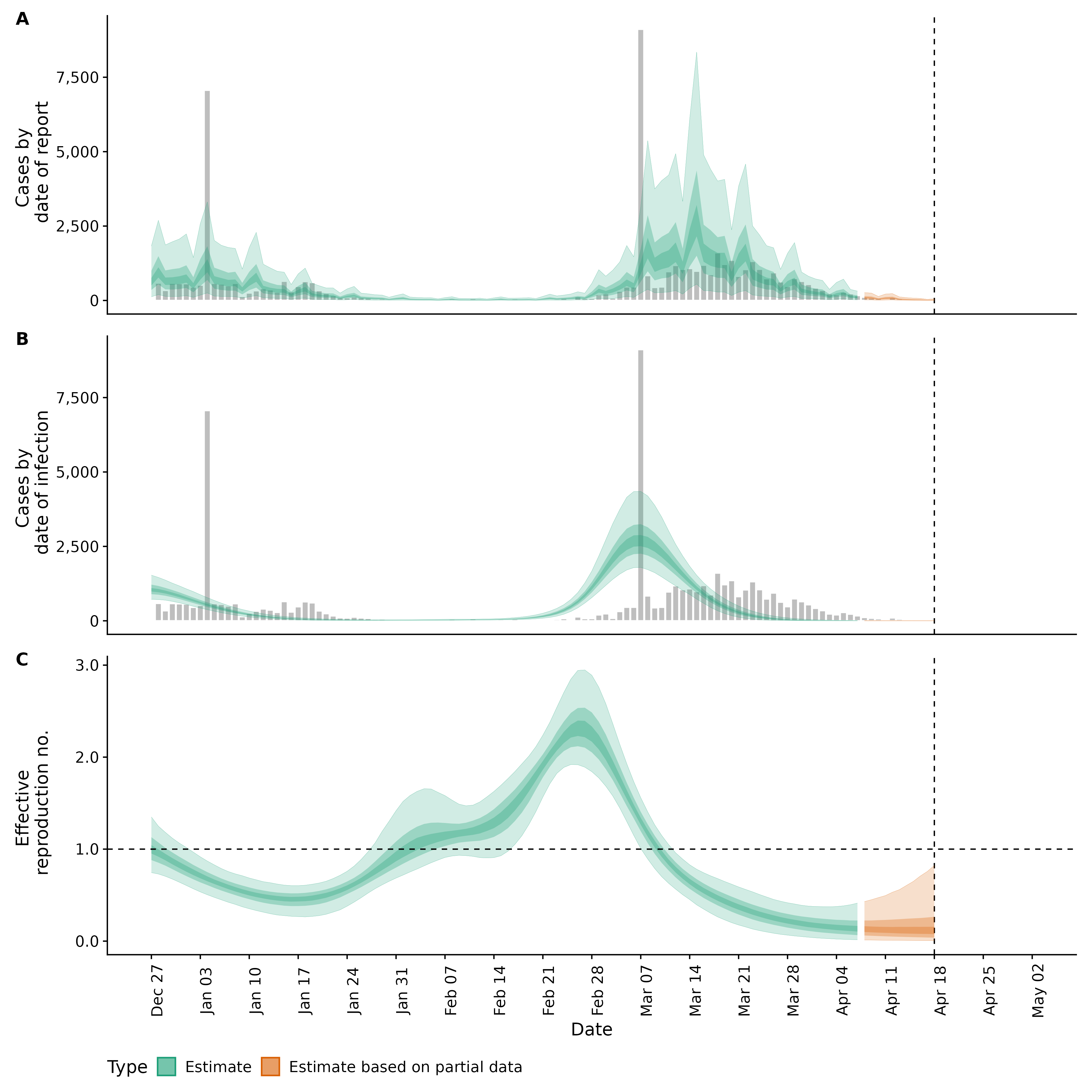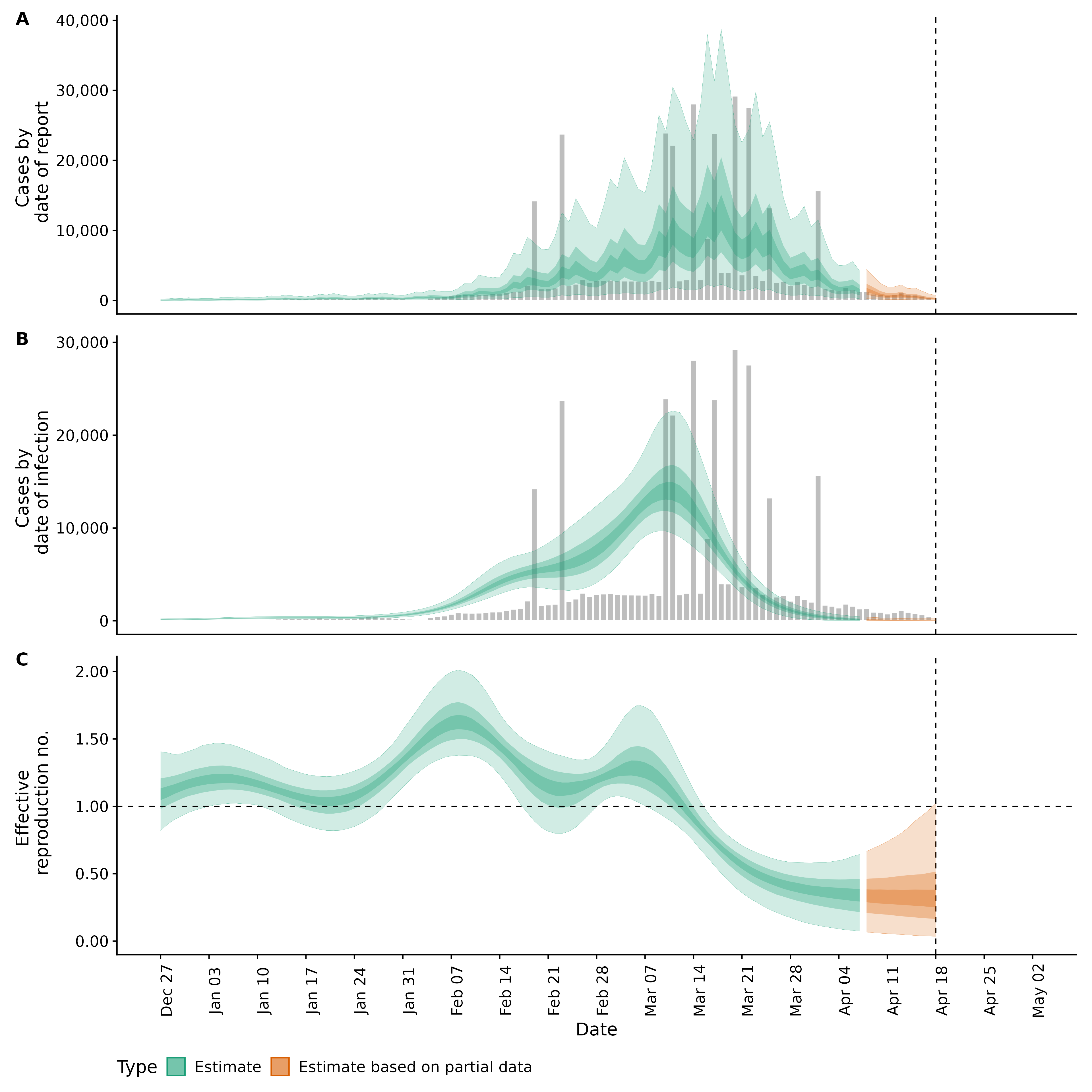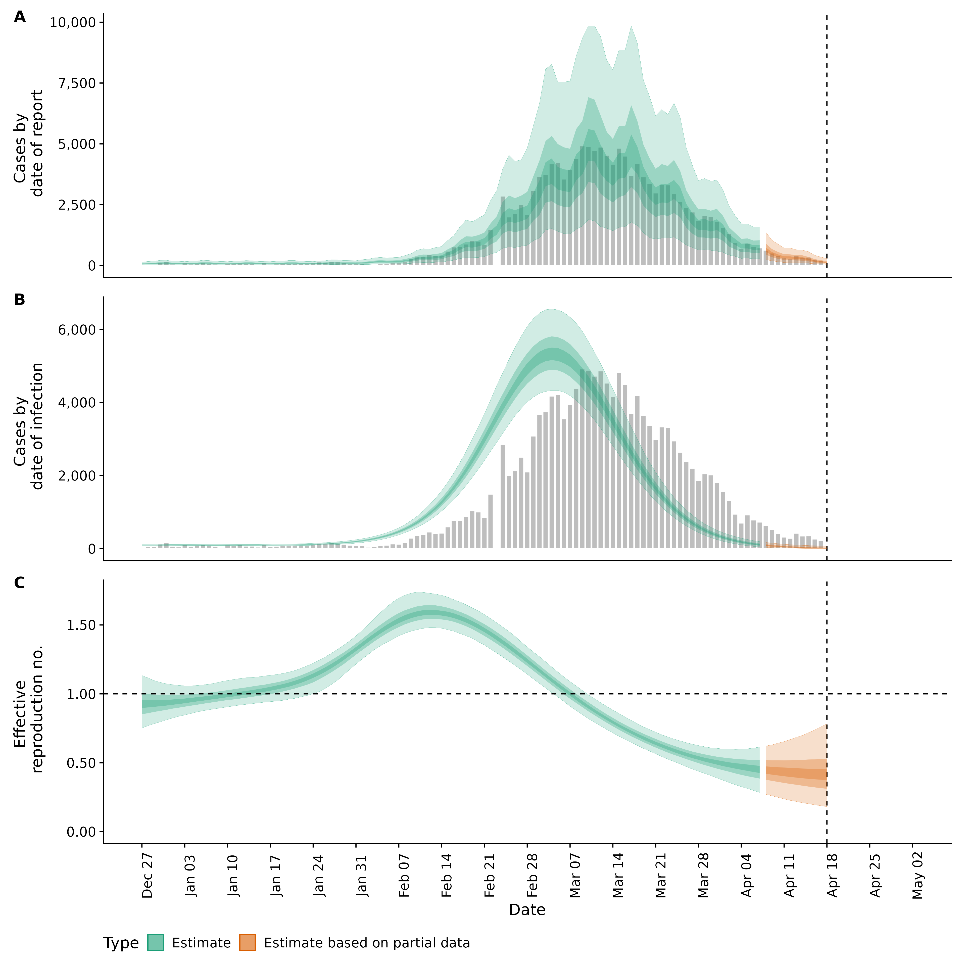 Identifying changes in the reproduction number, rate of spread, and doubling time during the course of the COVID-19 outbreak whilst accounting for potential biases due to delays in case reporting both nationally and subnationally. These results are impacted by changes in testing effort, increases and decreases in testing effort will increase and decrease reproduction number estimates respectively.