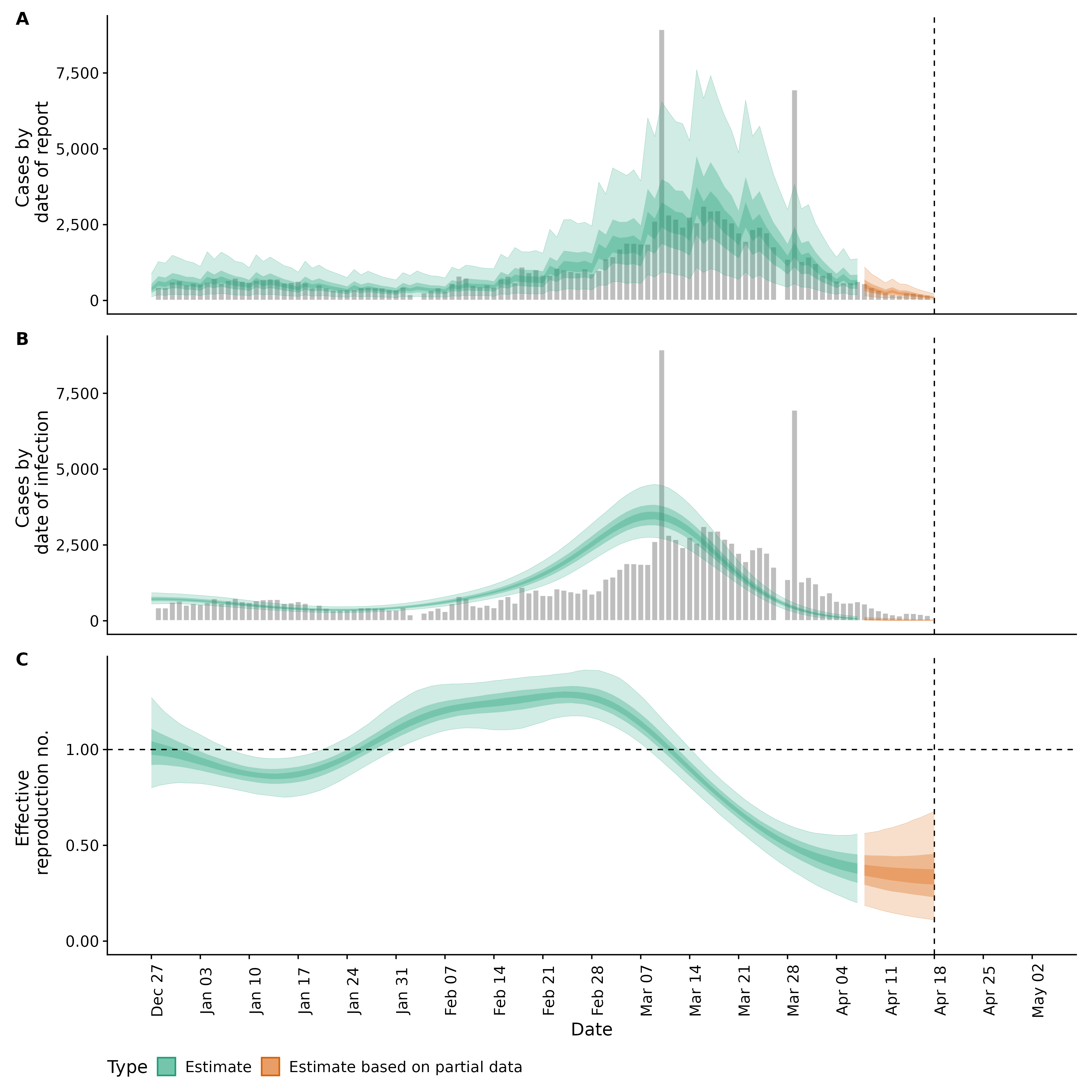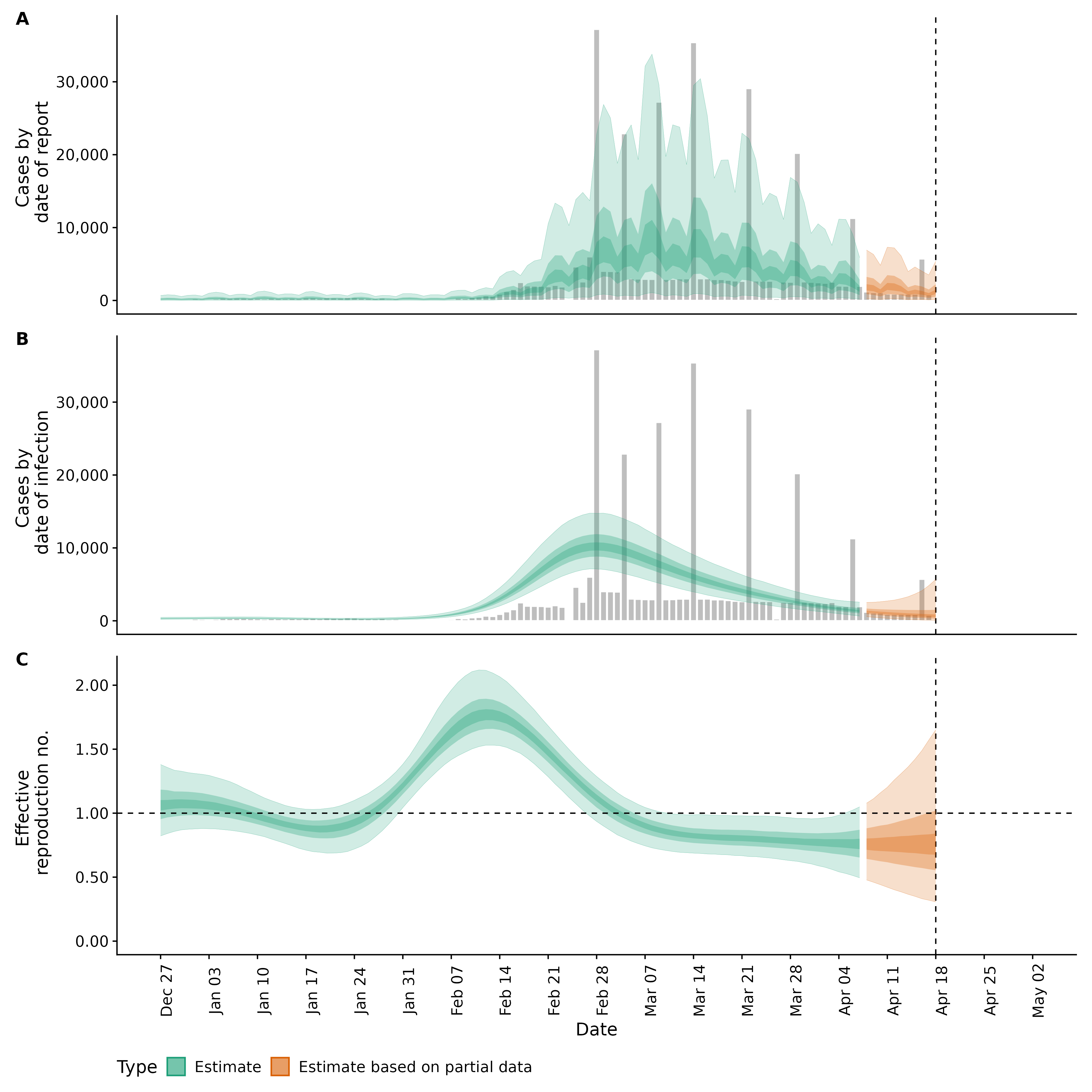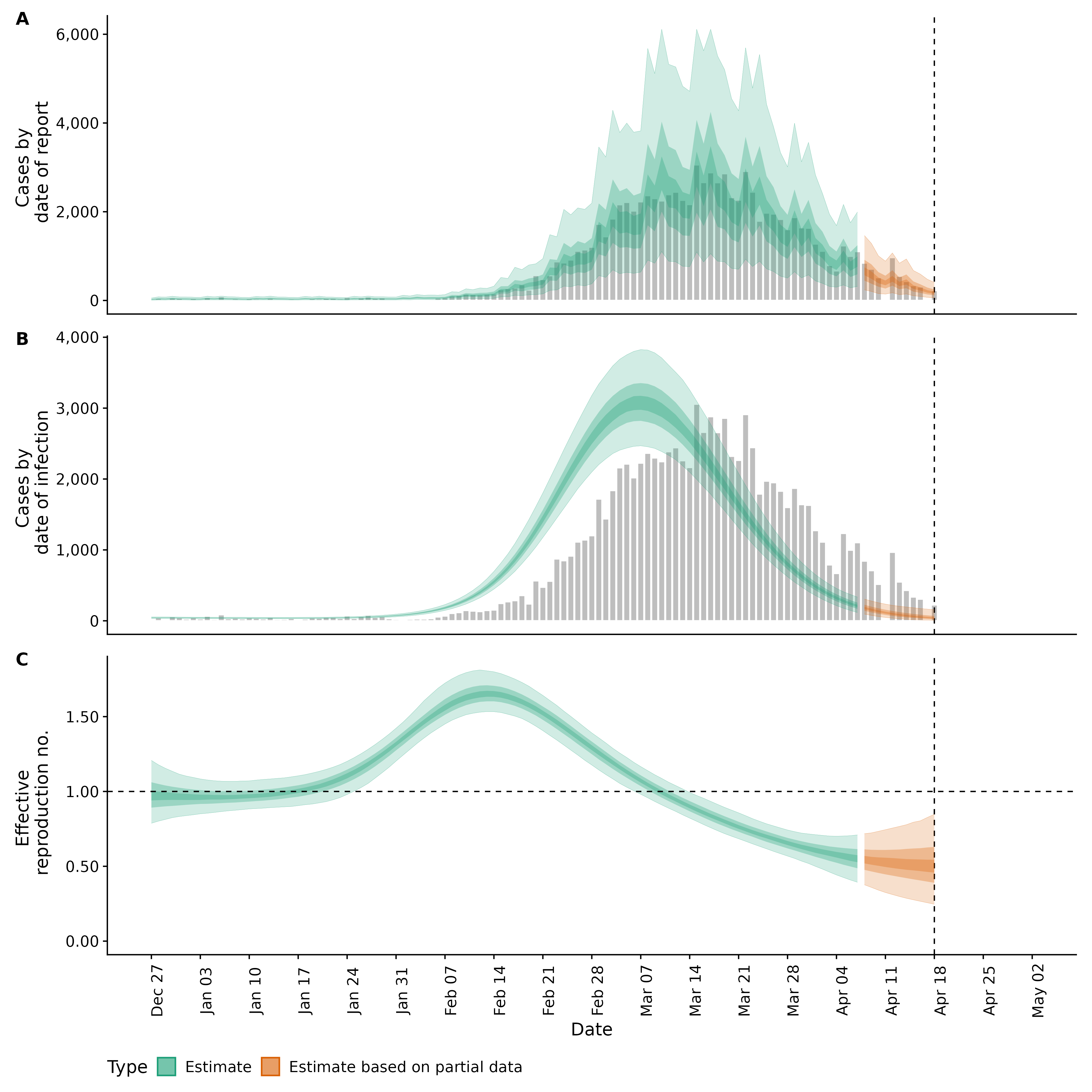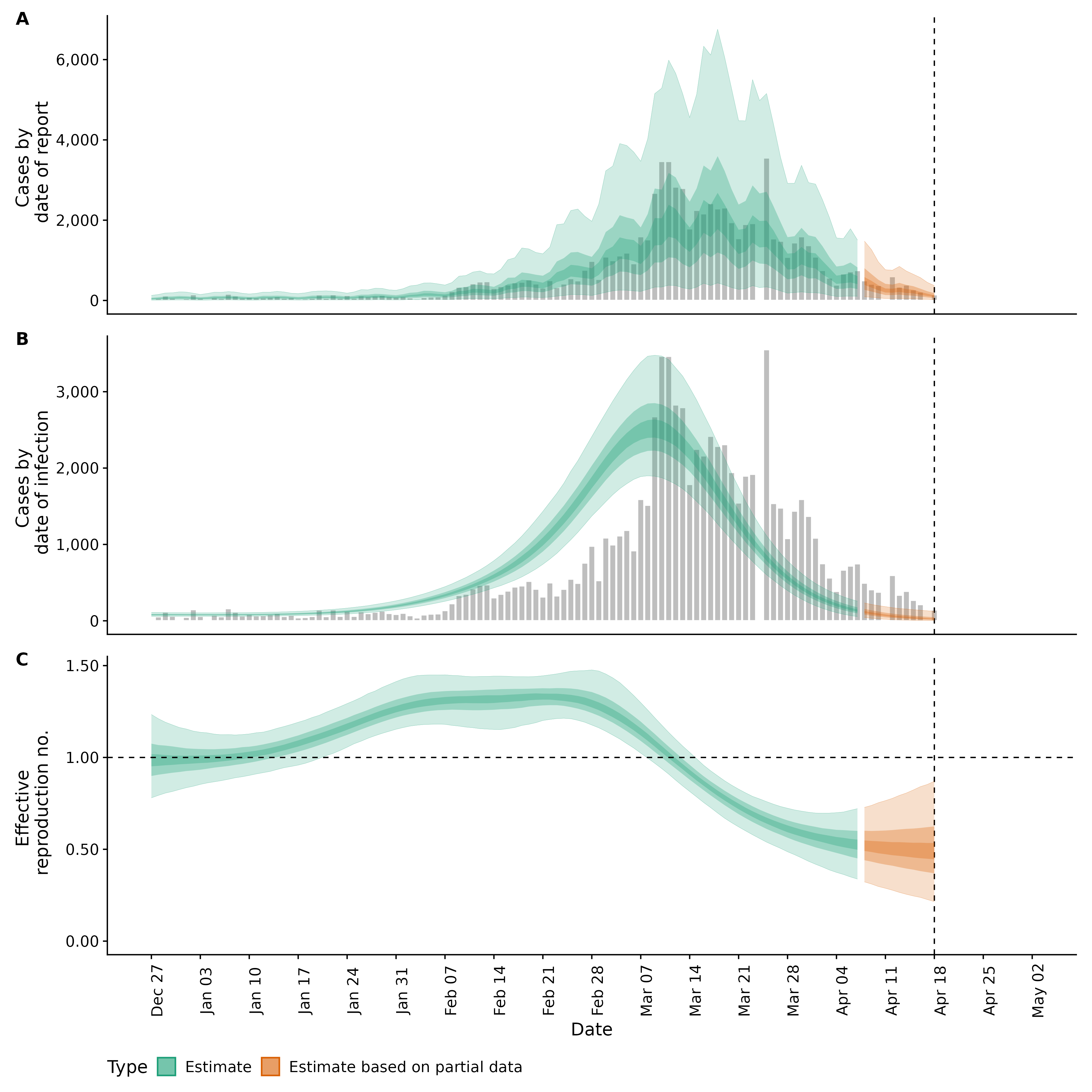 Identifying changes in the reproduction number, rate of spread, and doubling time during the course of the COVID-19 outbreak whilst accounting for potential biases due to delays in case reporting both nationally and subnationally. These results are impacted by changes in testing effort, increases and decreases in testing effort will increase and decrease reproduction number estimates respectively.