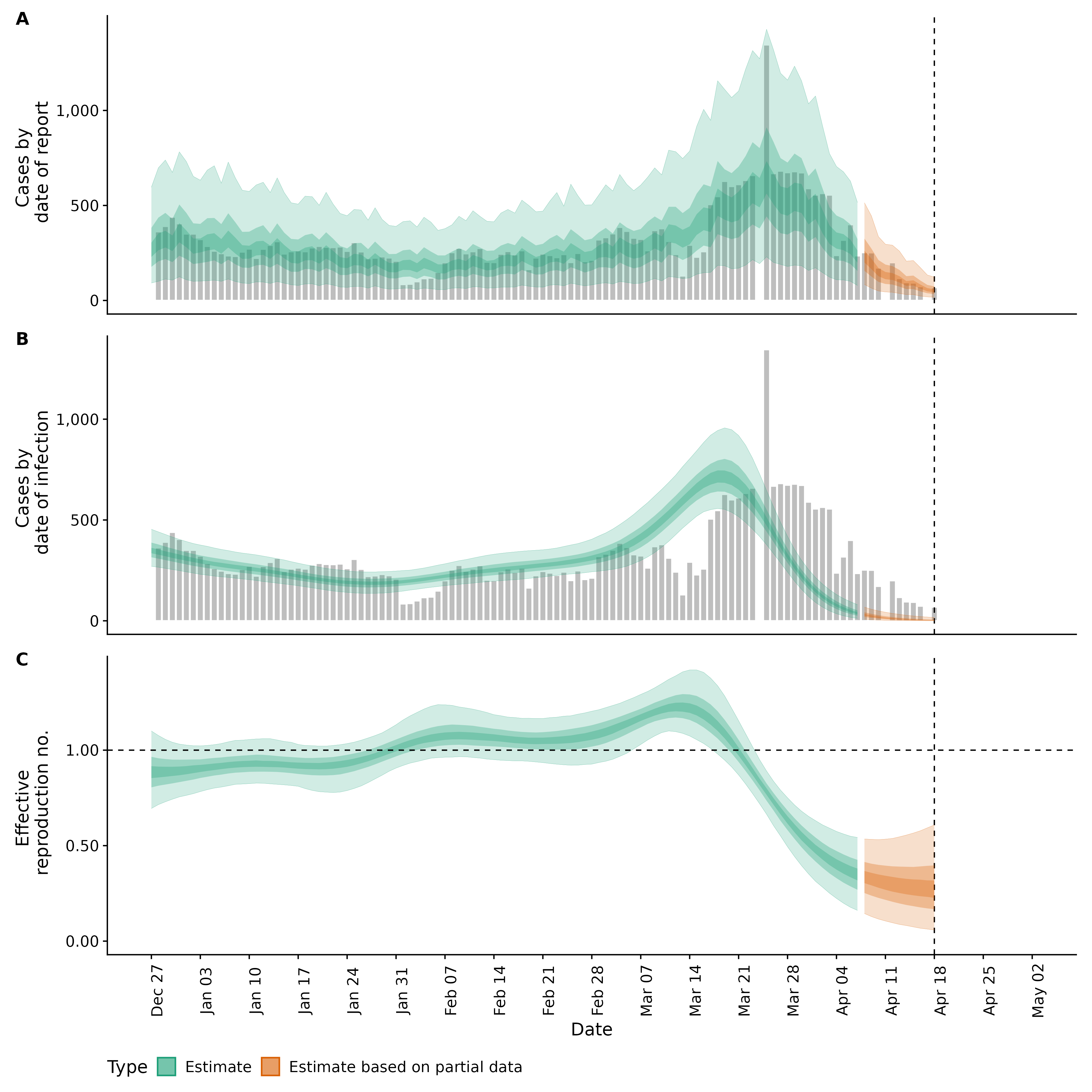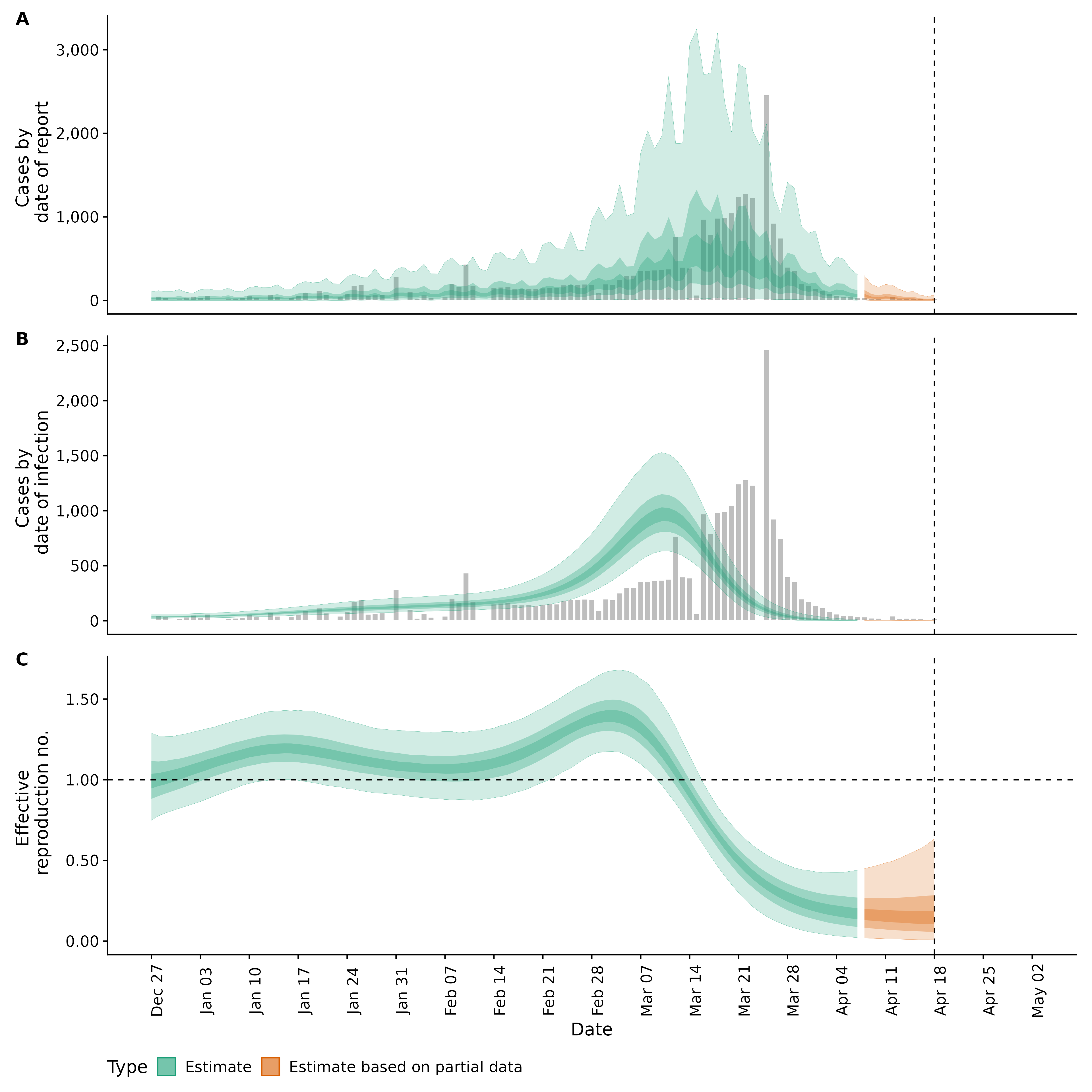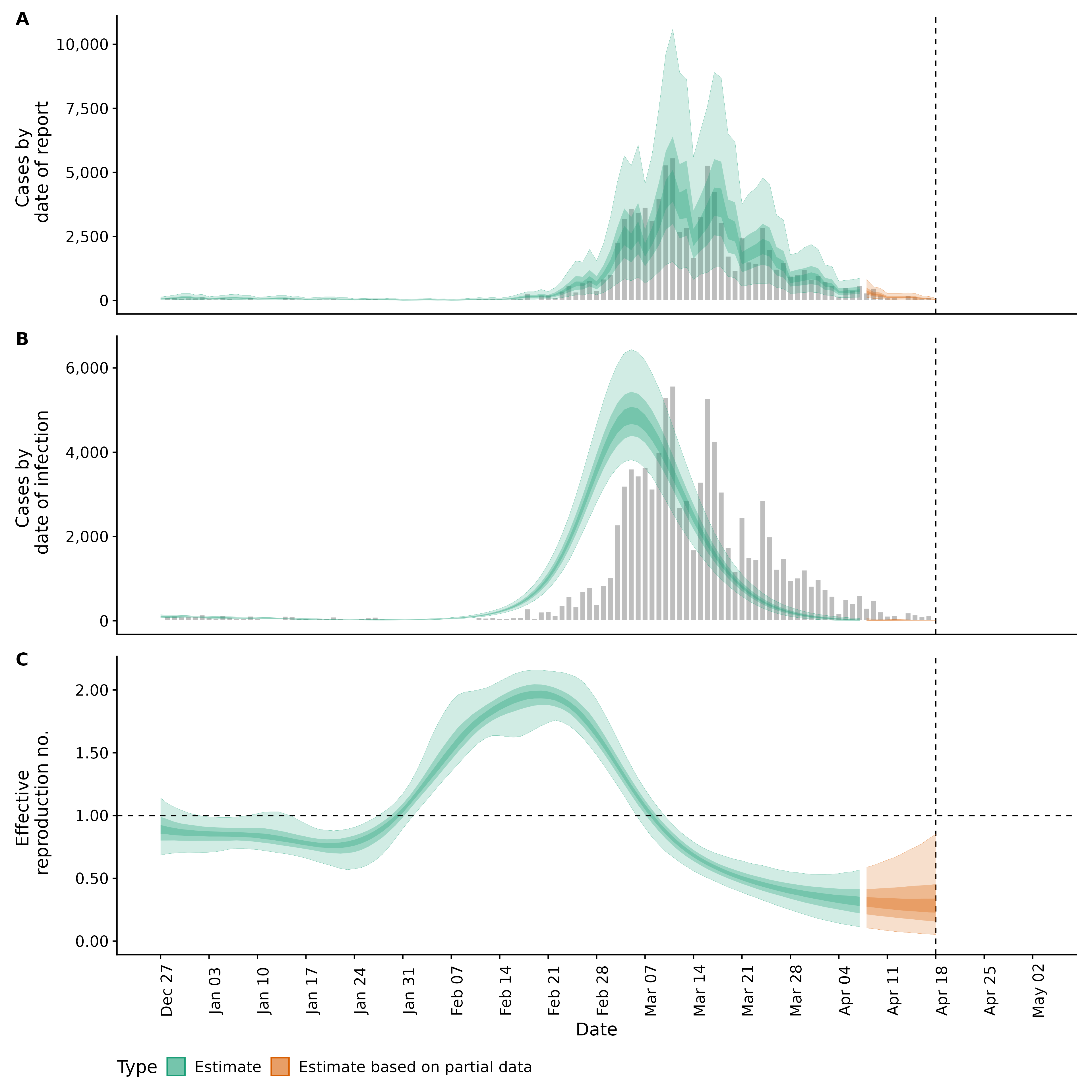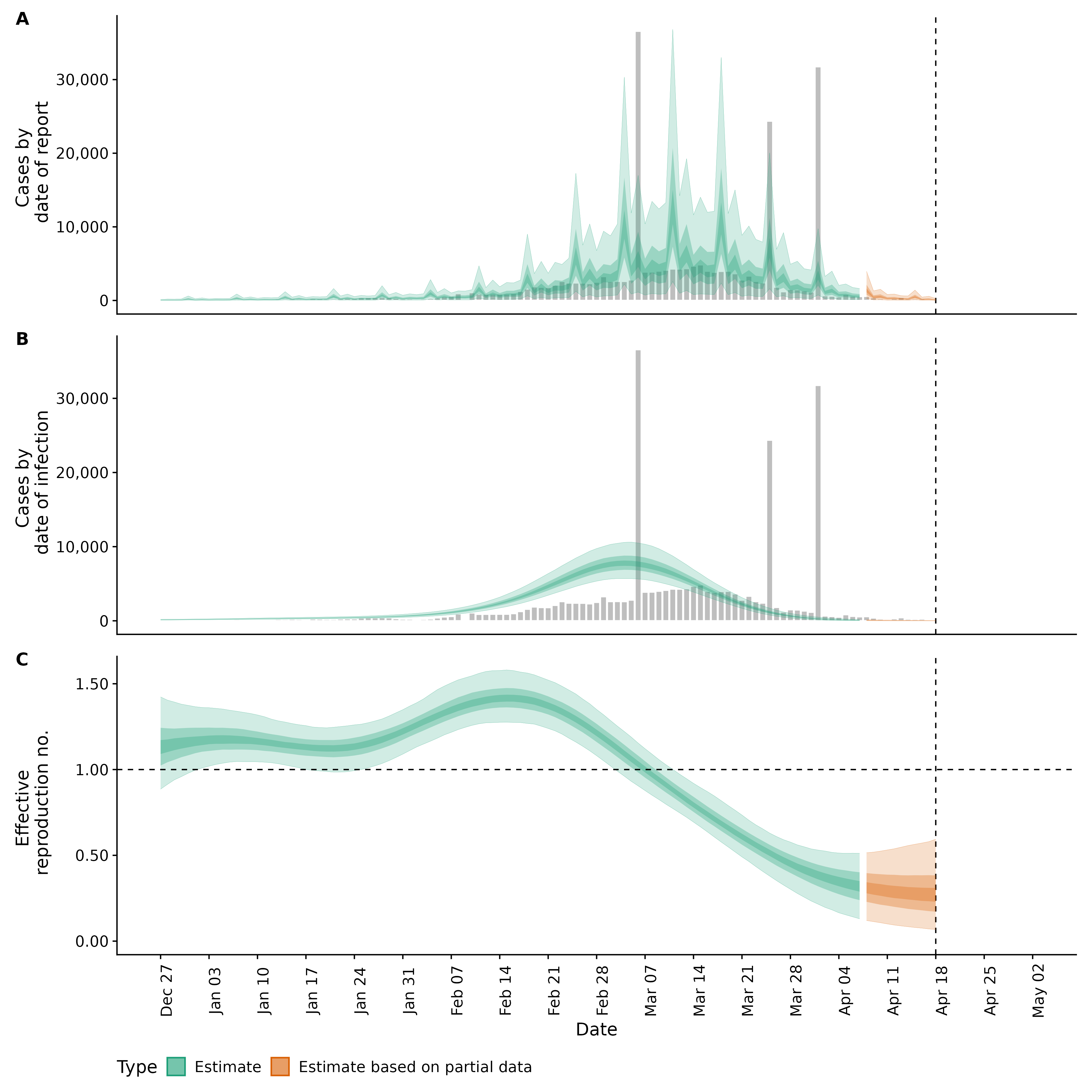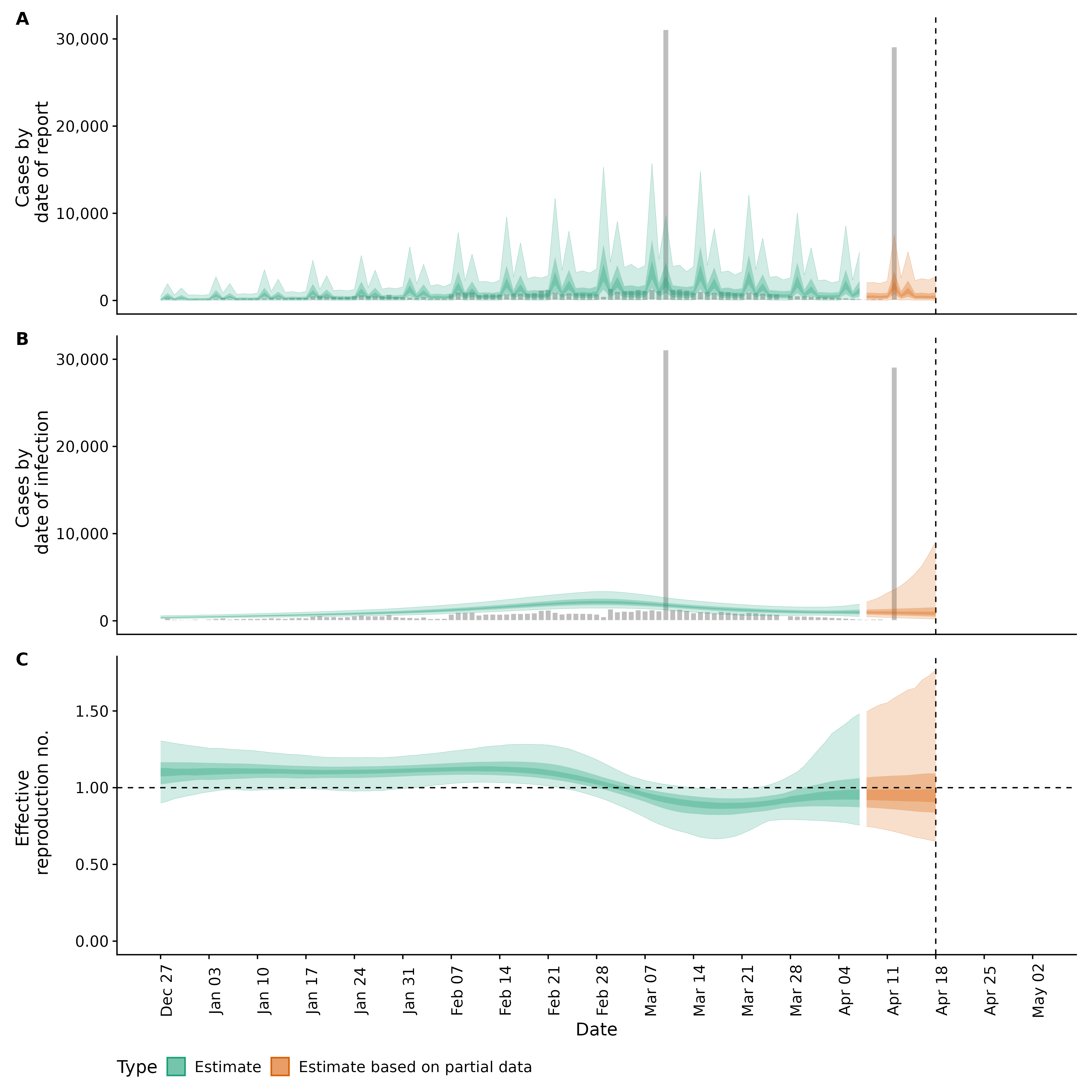 Identifying changes in the reproduction number, rate of spread, and doubling time during the course of the COVID-19 outbreak whilst accounting for potential biases due to delays in case reporting both nationally and subnationally. These results are impacted by changes in testing effort, increases and decreases in testing effort will increase and decrease reproduction number estimates respectively.