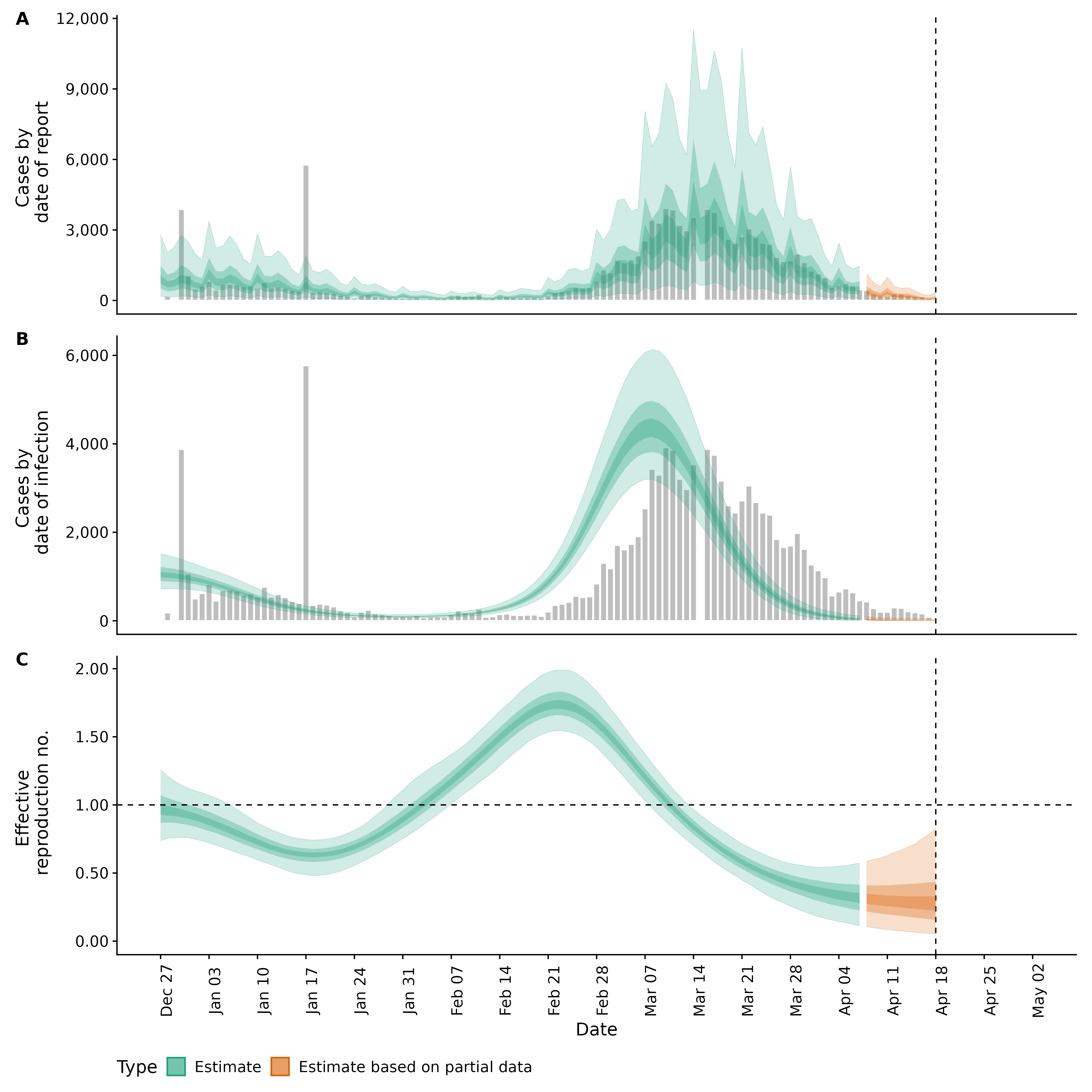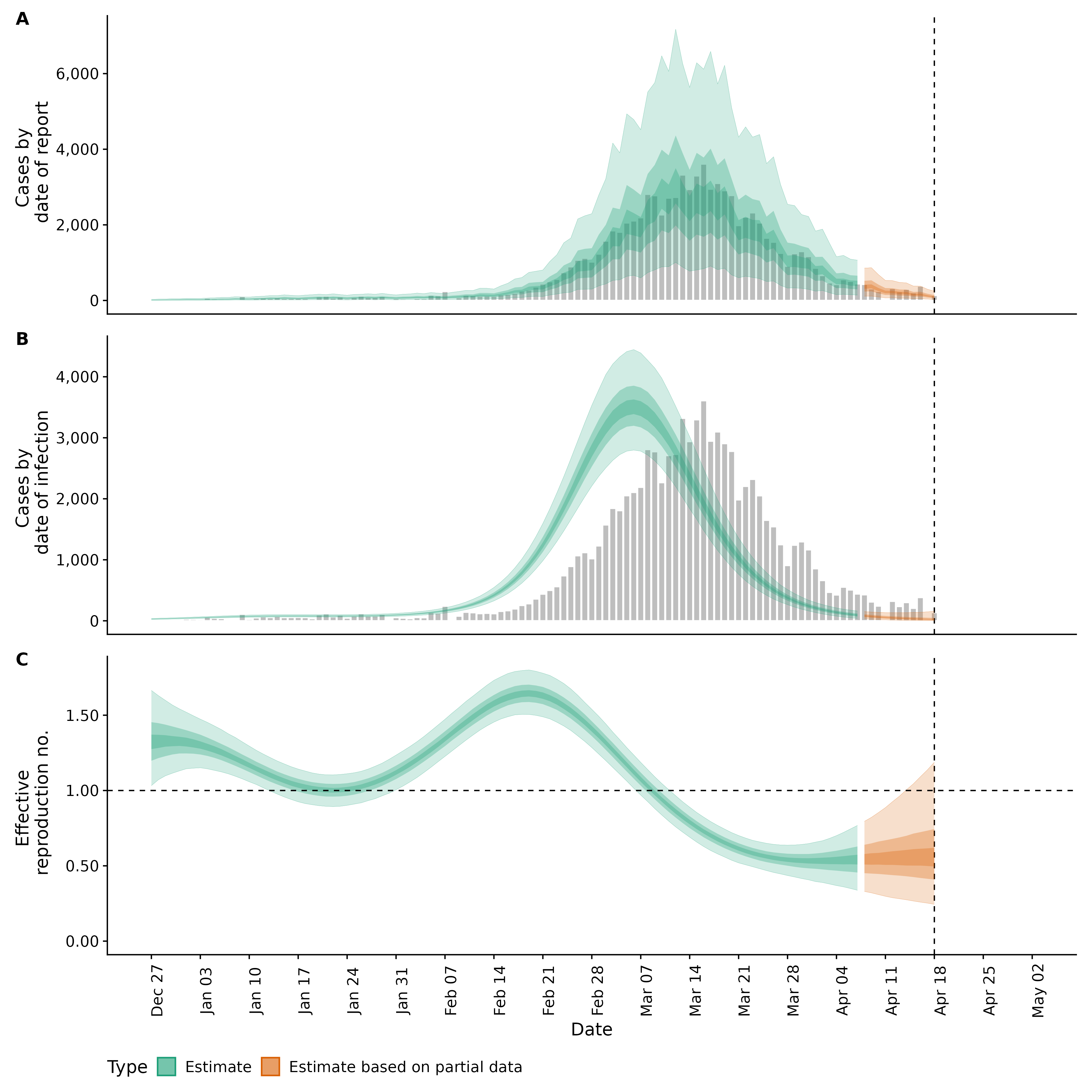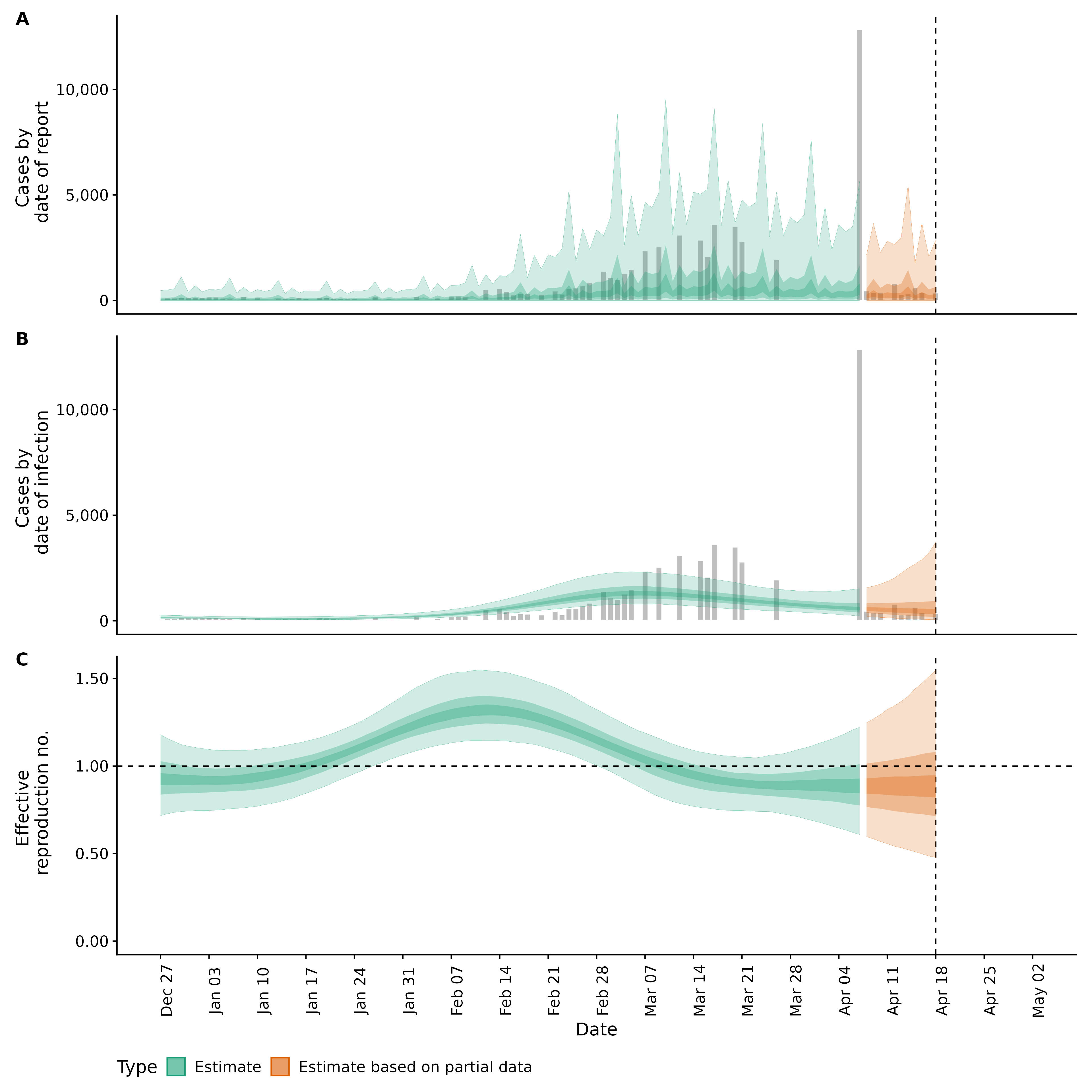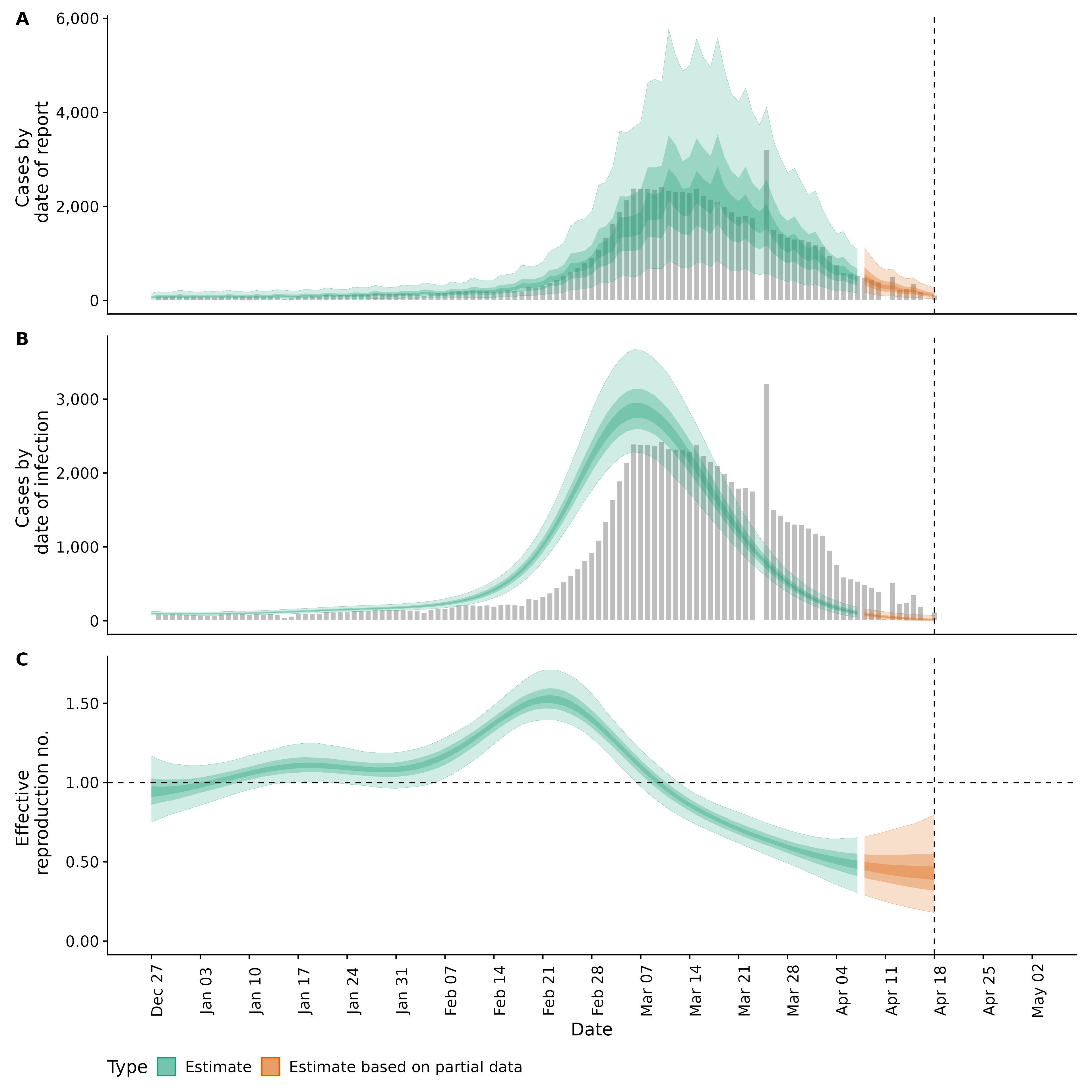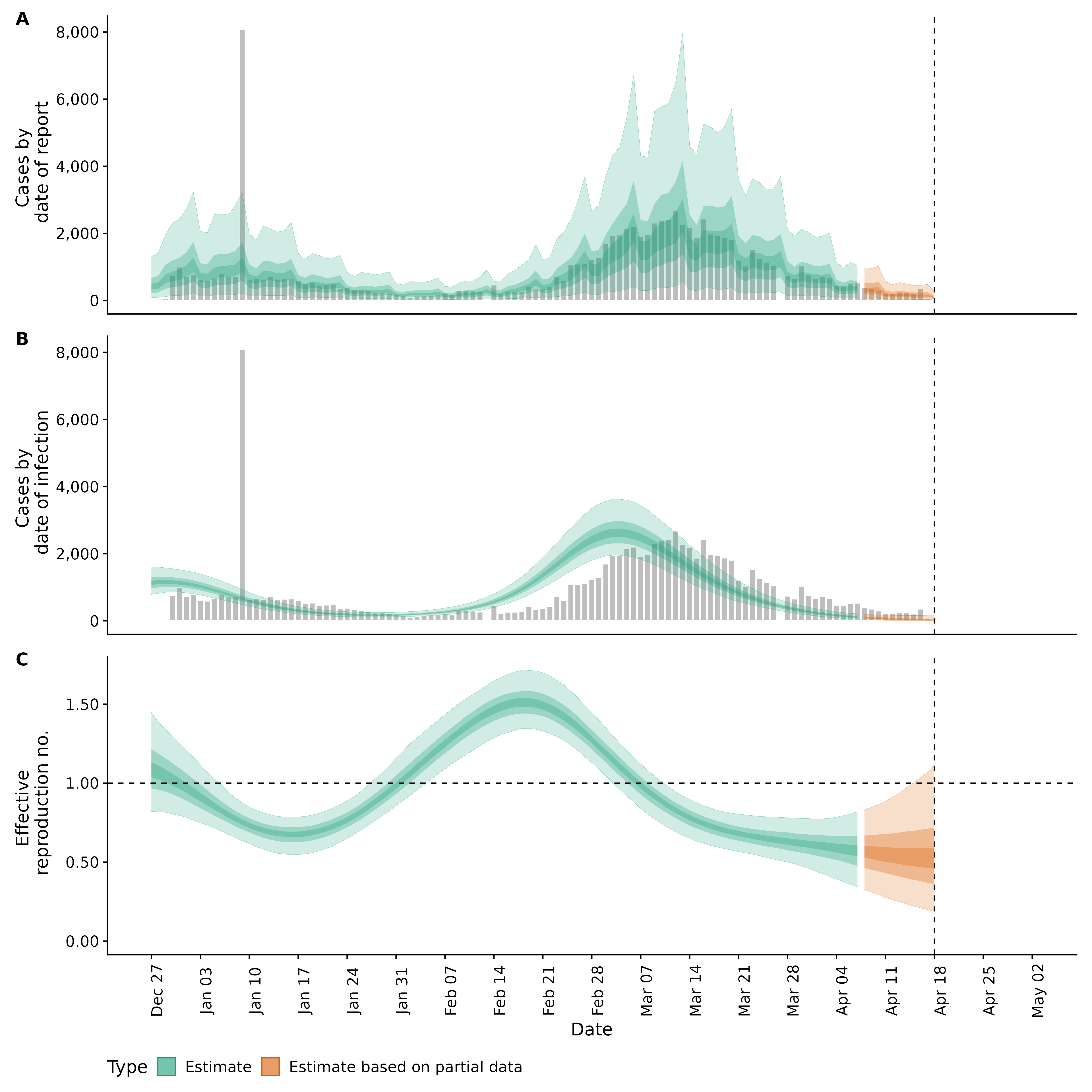 Identifying changes in the reproduction number, rate of spread, and doubling time during the course of the COVID-19 outbreak whilst accounting for potential biases due to delays in case reporting in Backan. These results are impacted by changes in testing effort, increases and decreases in testing effort will increase and decrease reproduction number estimates respectively.