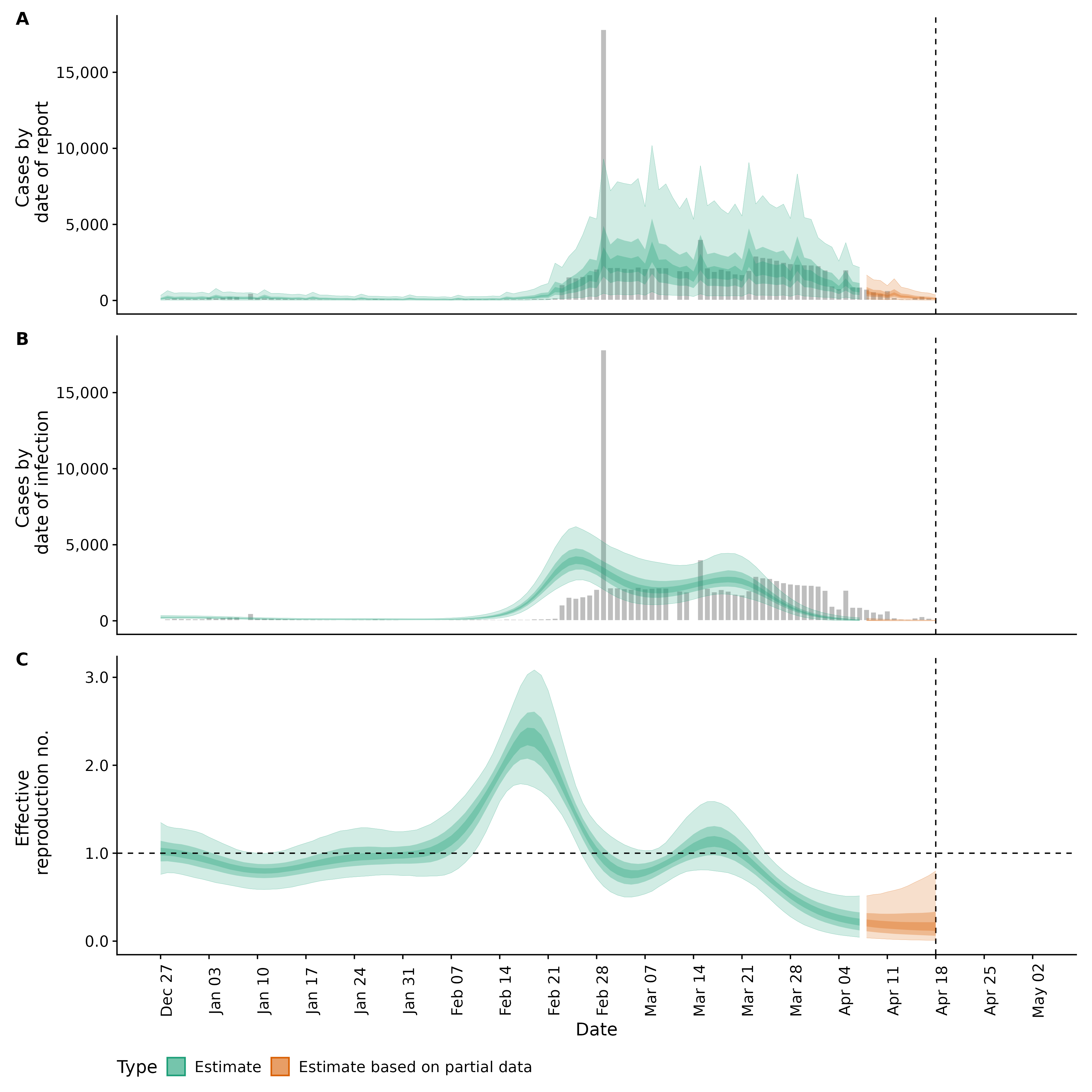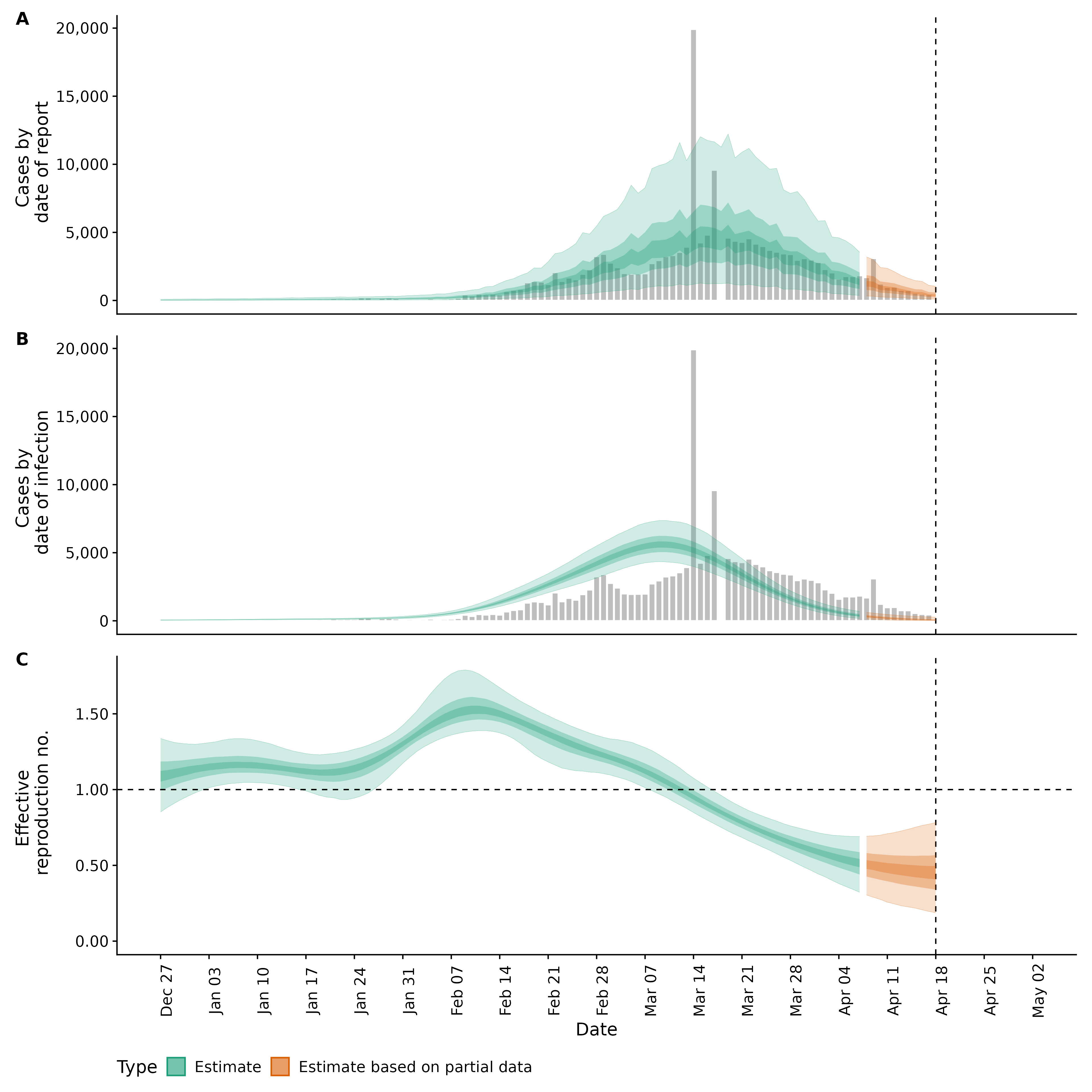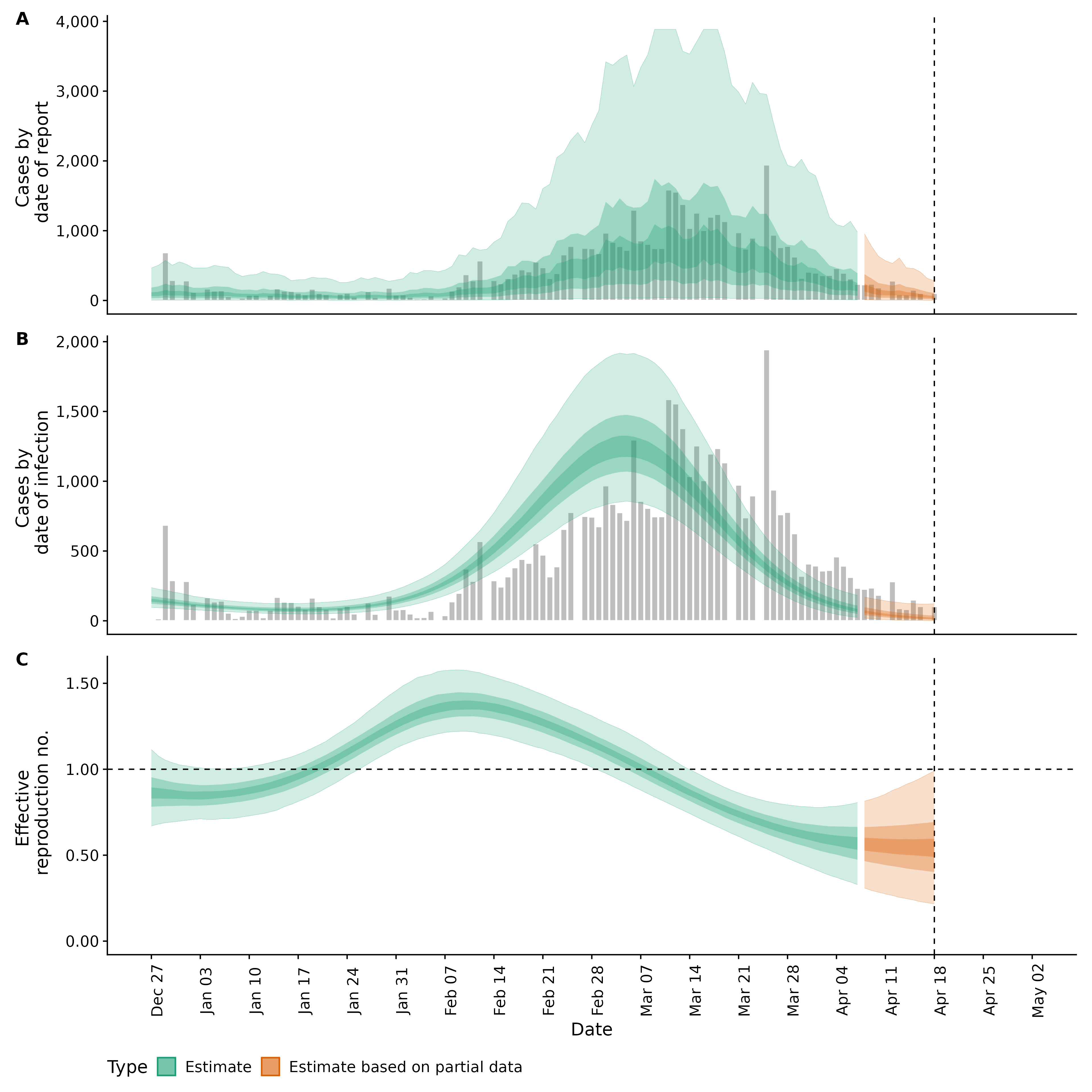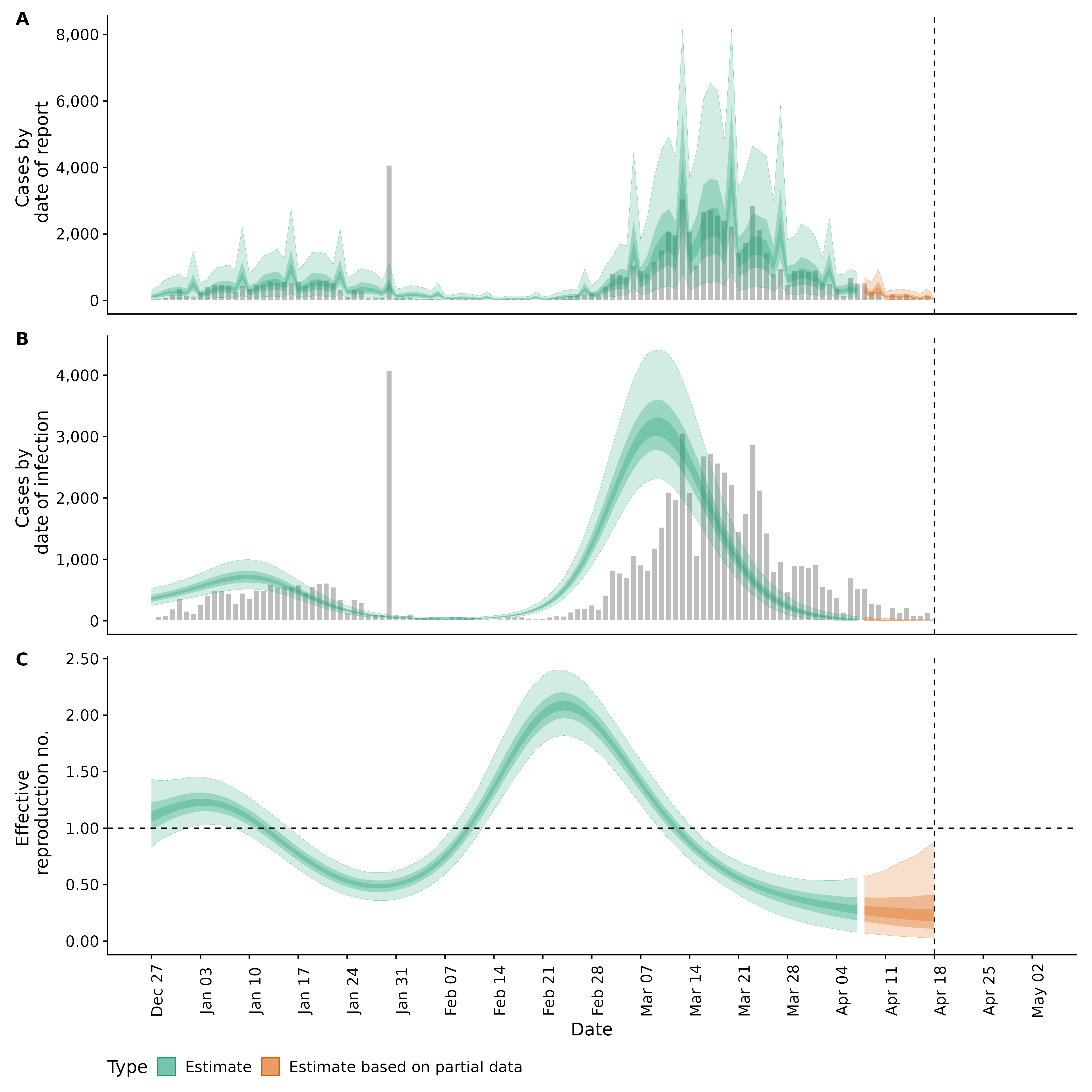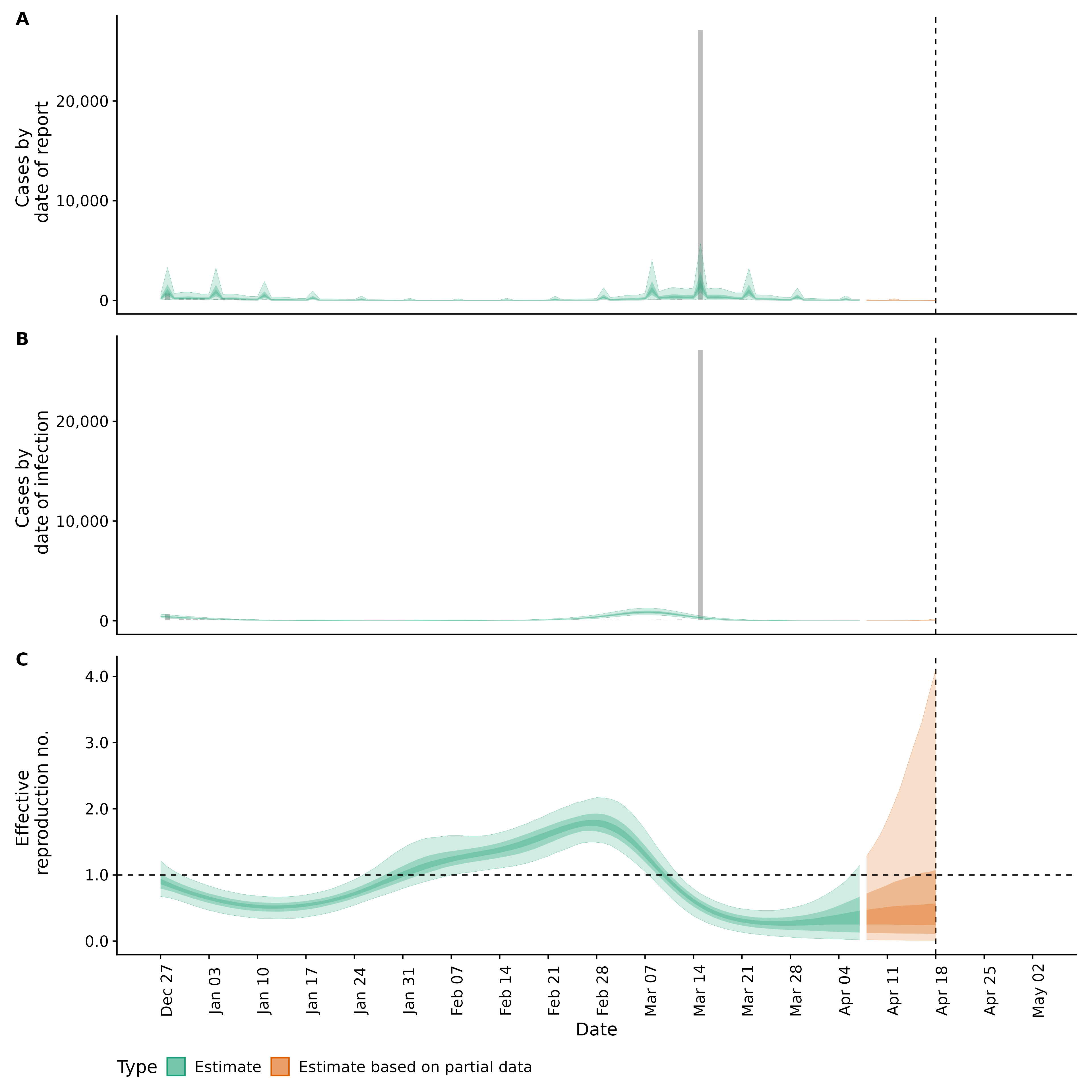 Identifying changes in the reproduction number, rate of spread, and doubling time during the course of the COVID-19 outbreak whilst accounting for potential biases due to delays in case reporting in Backan. These results are impacted by changes in testing effort, increases and decreases in testing effort will increase and decrease reproduction number estimates respectively.