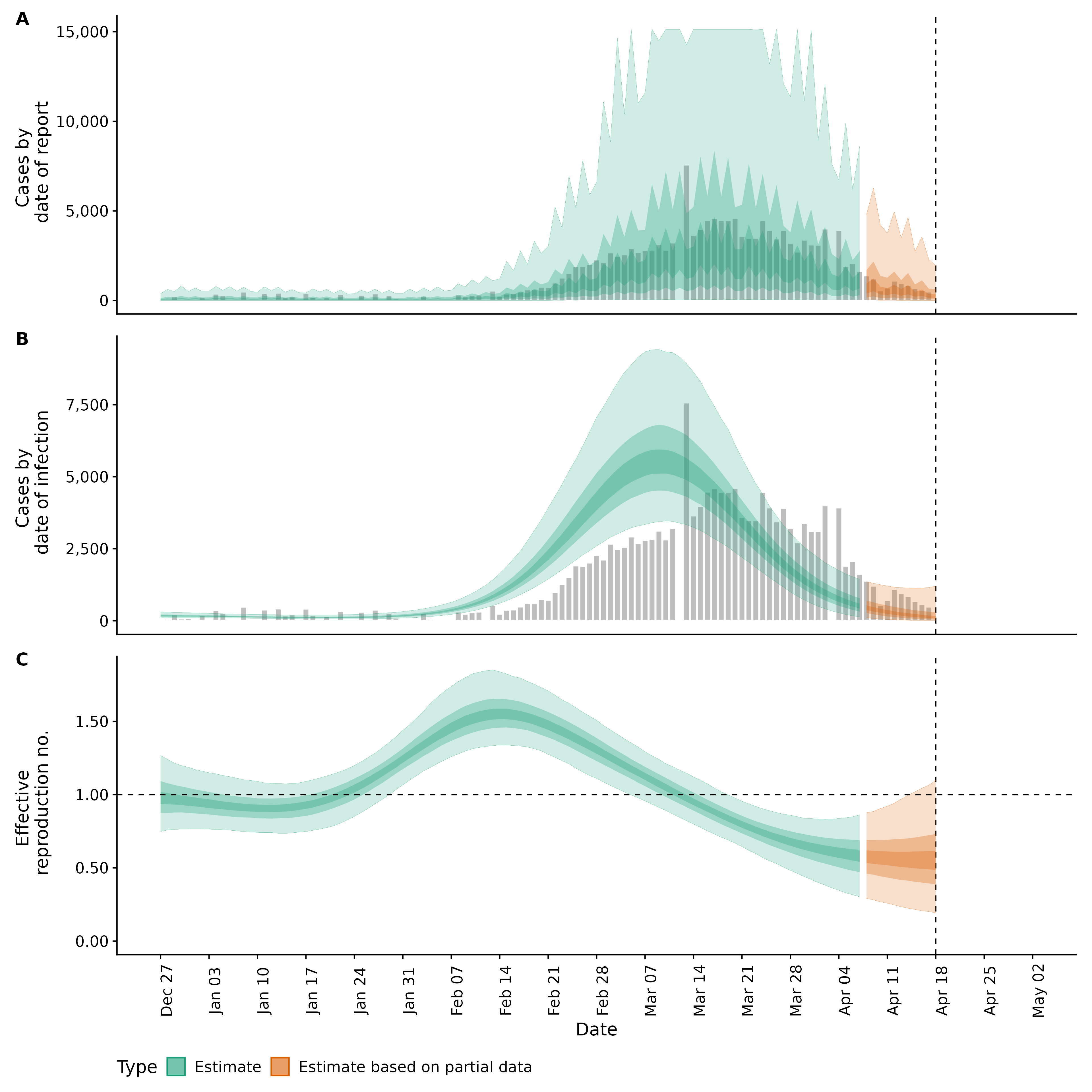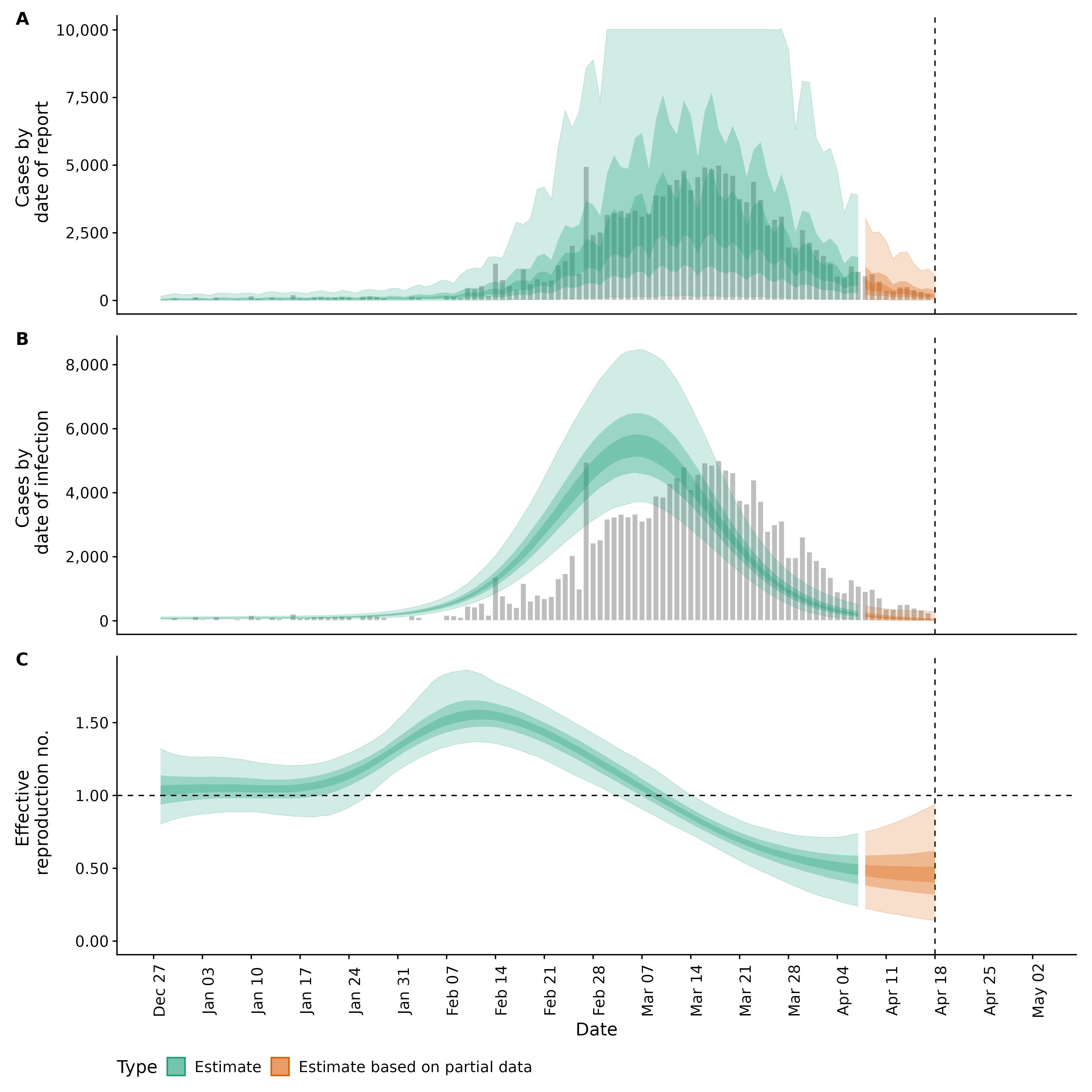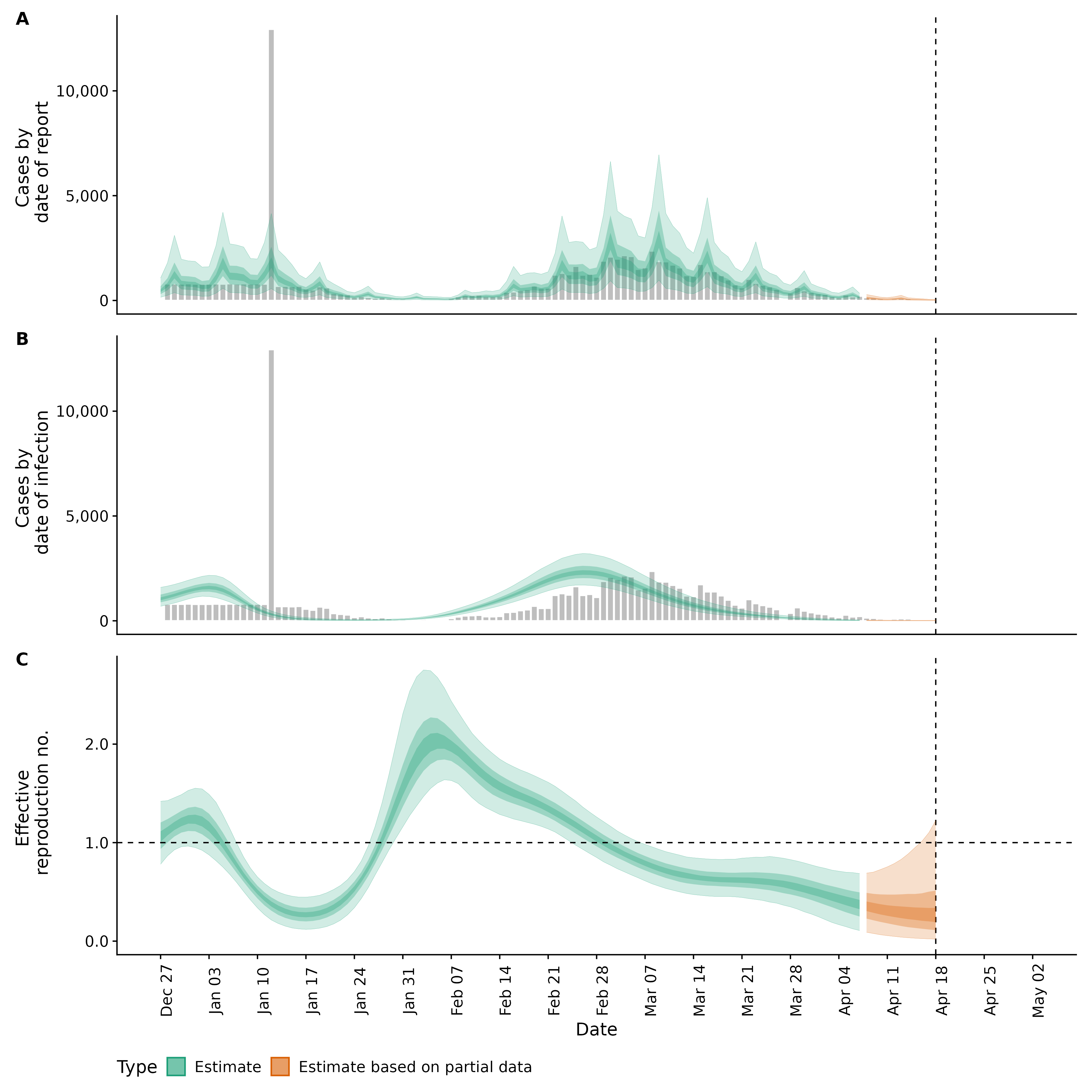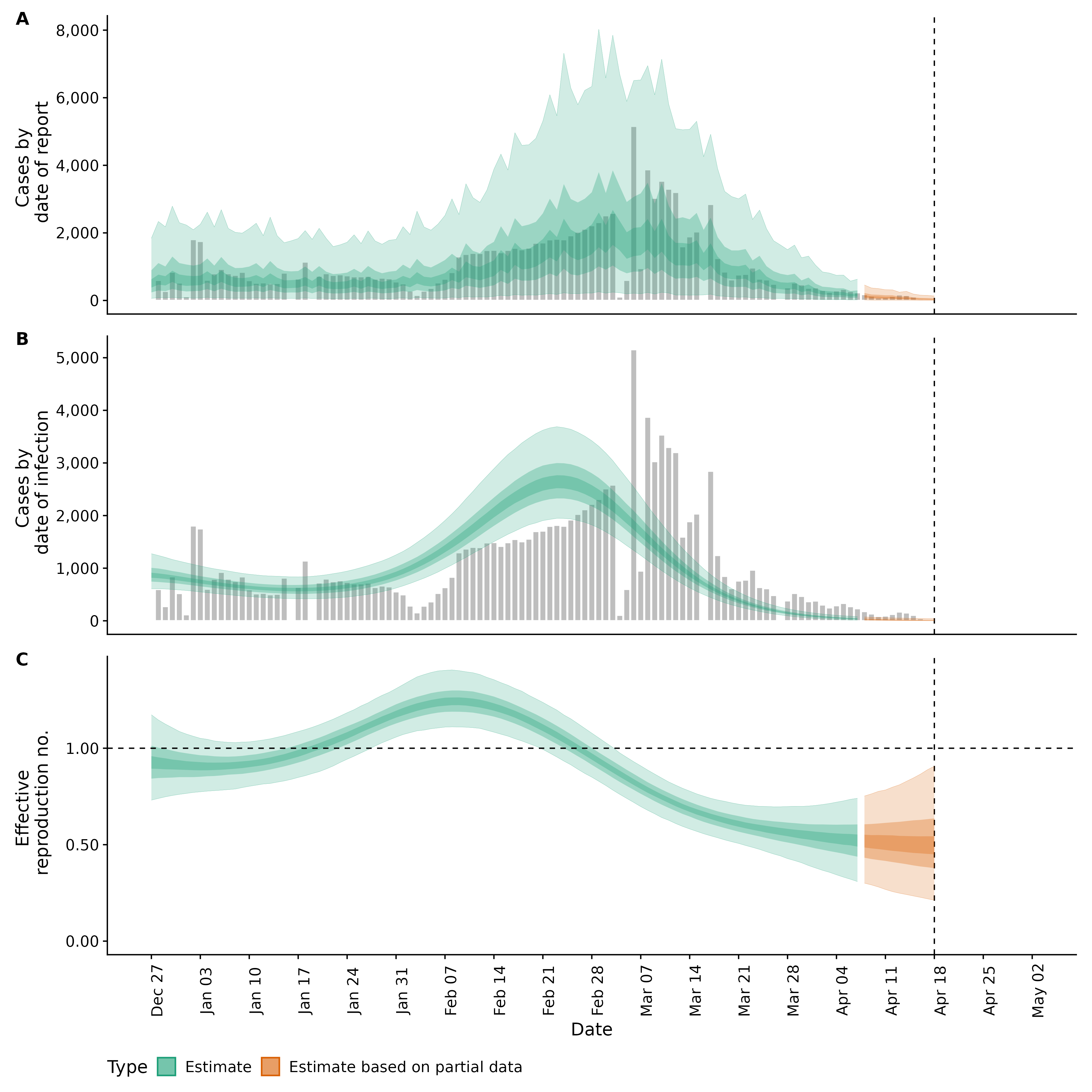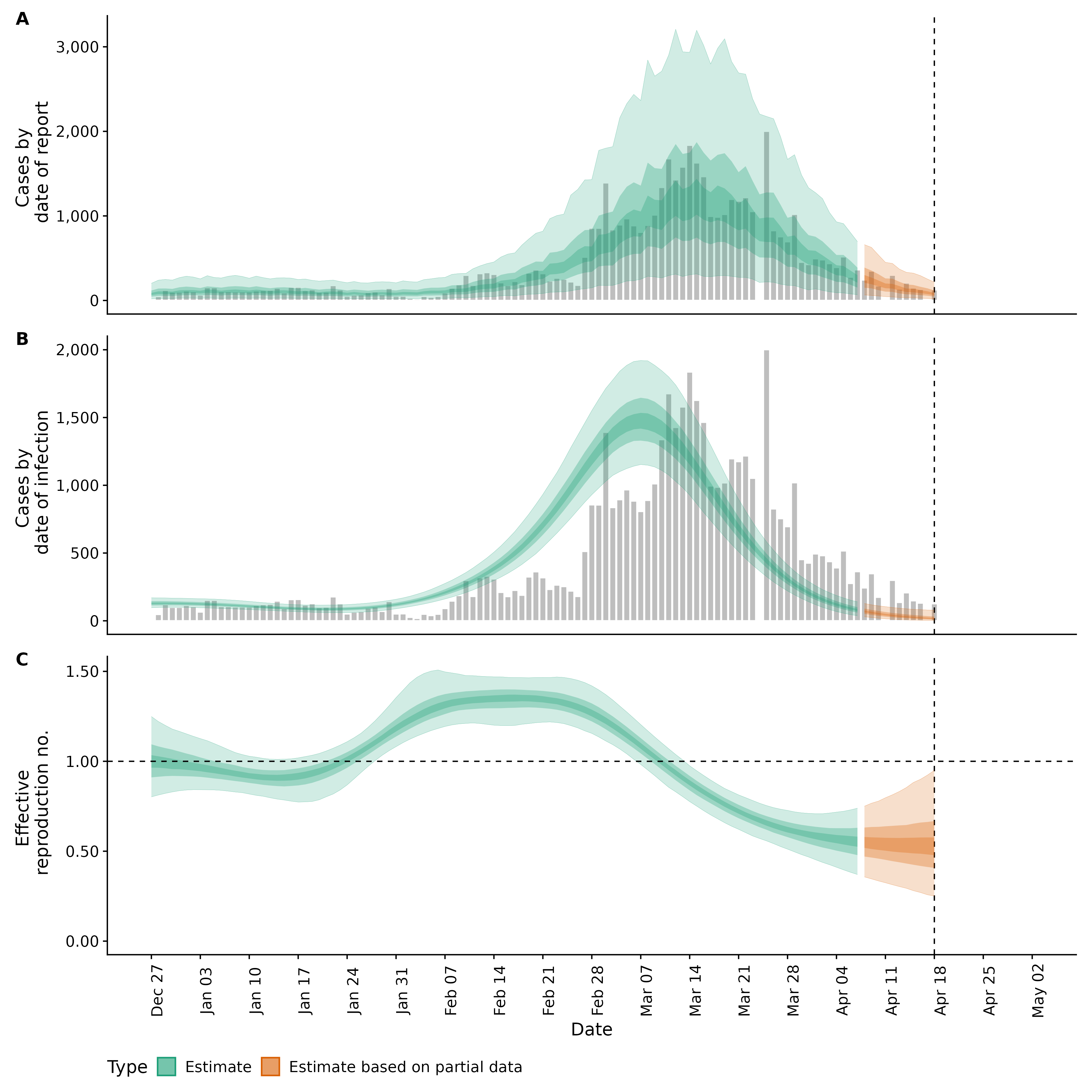 Identifying changes in the reproduction number, rate of spread, and doubling time during the course of the COVID-19 outbreak whilst accounting for potential biases due to delays in case reporting in Backan. These results are impacted by changes in testing effort, increases and decreases in testing effort will increase and decrease reproduction number estimates respectively.