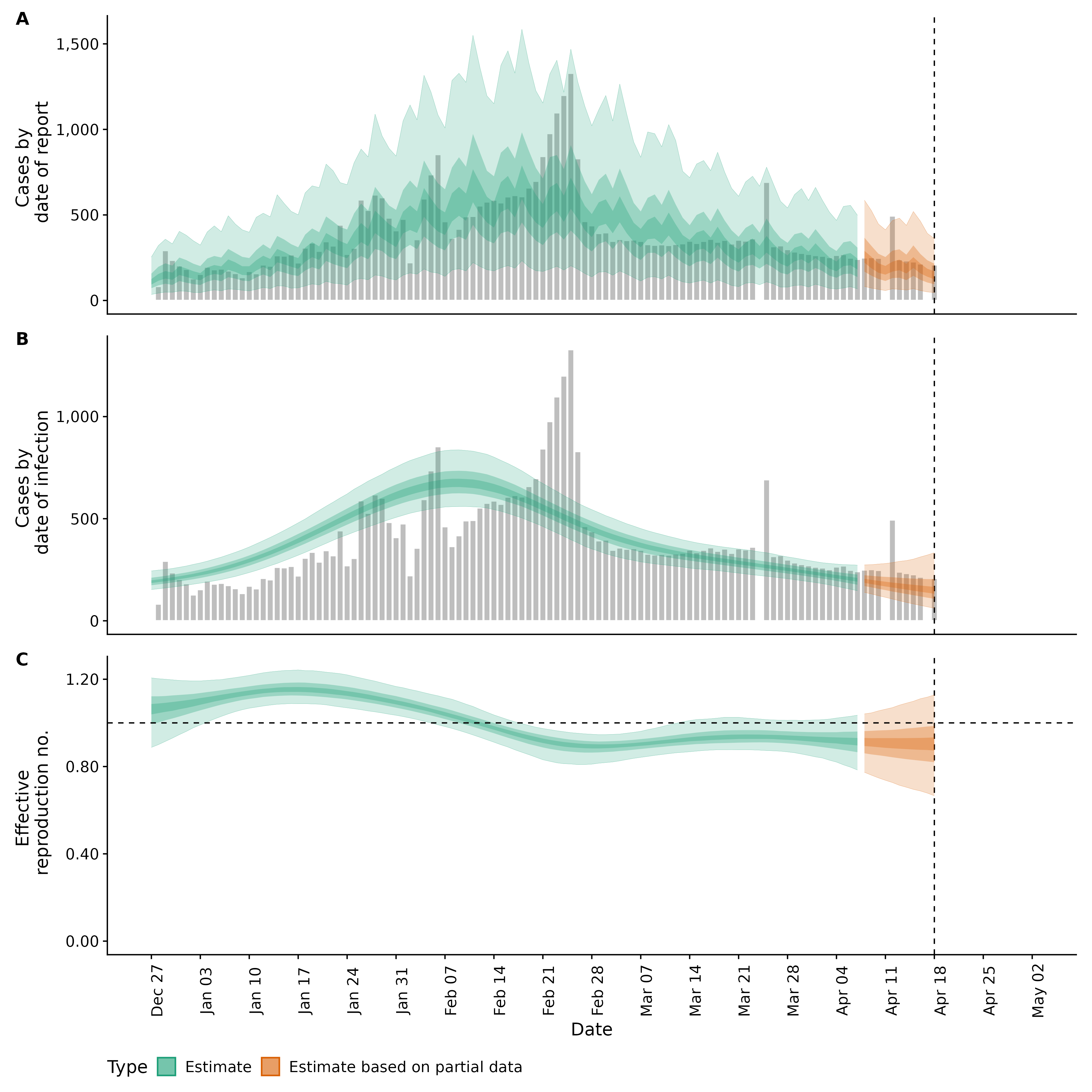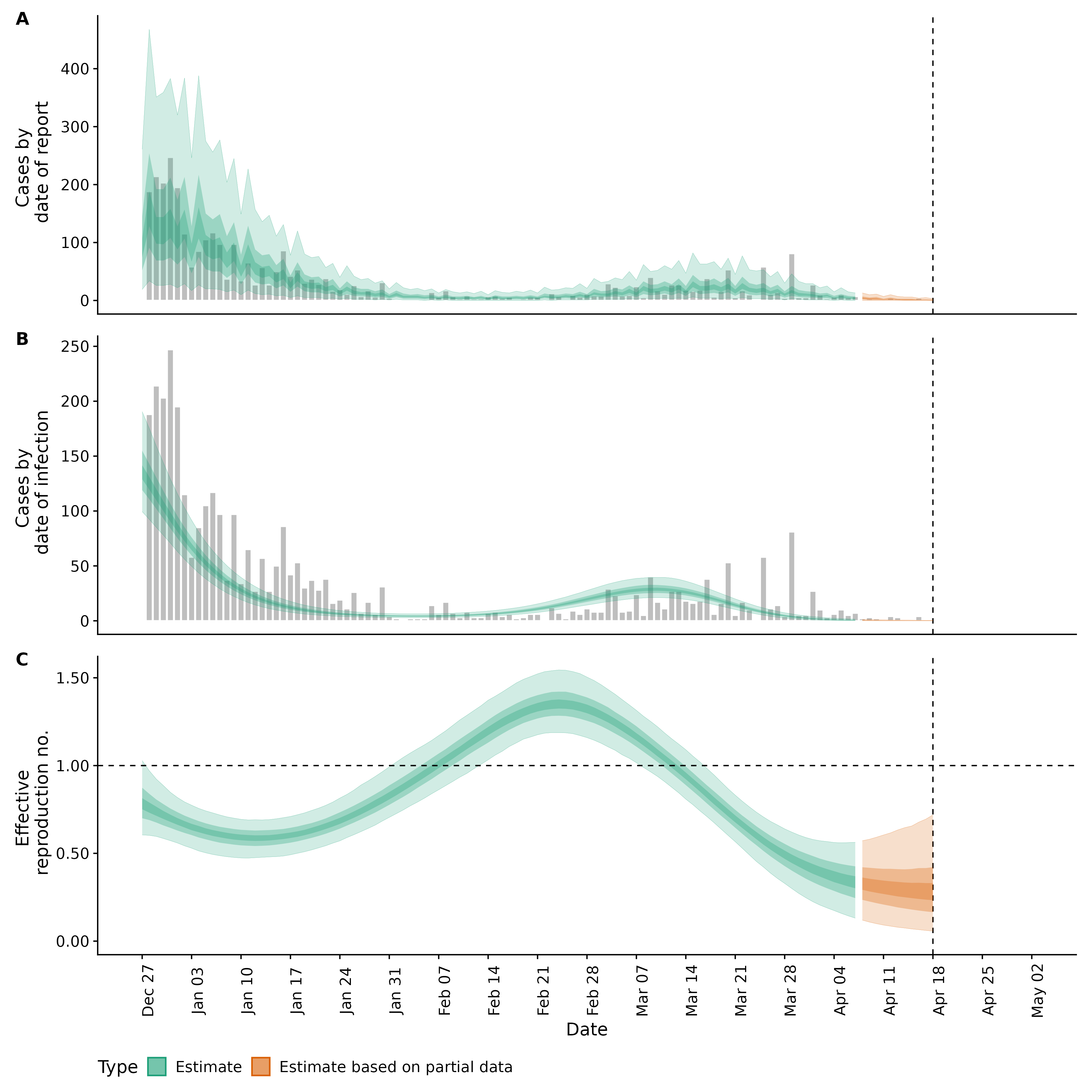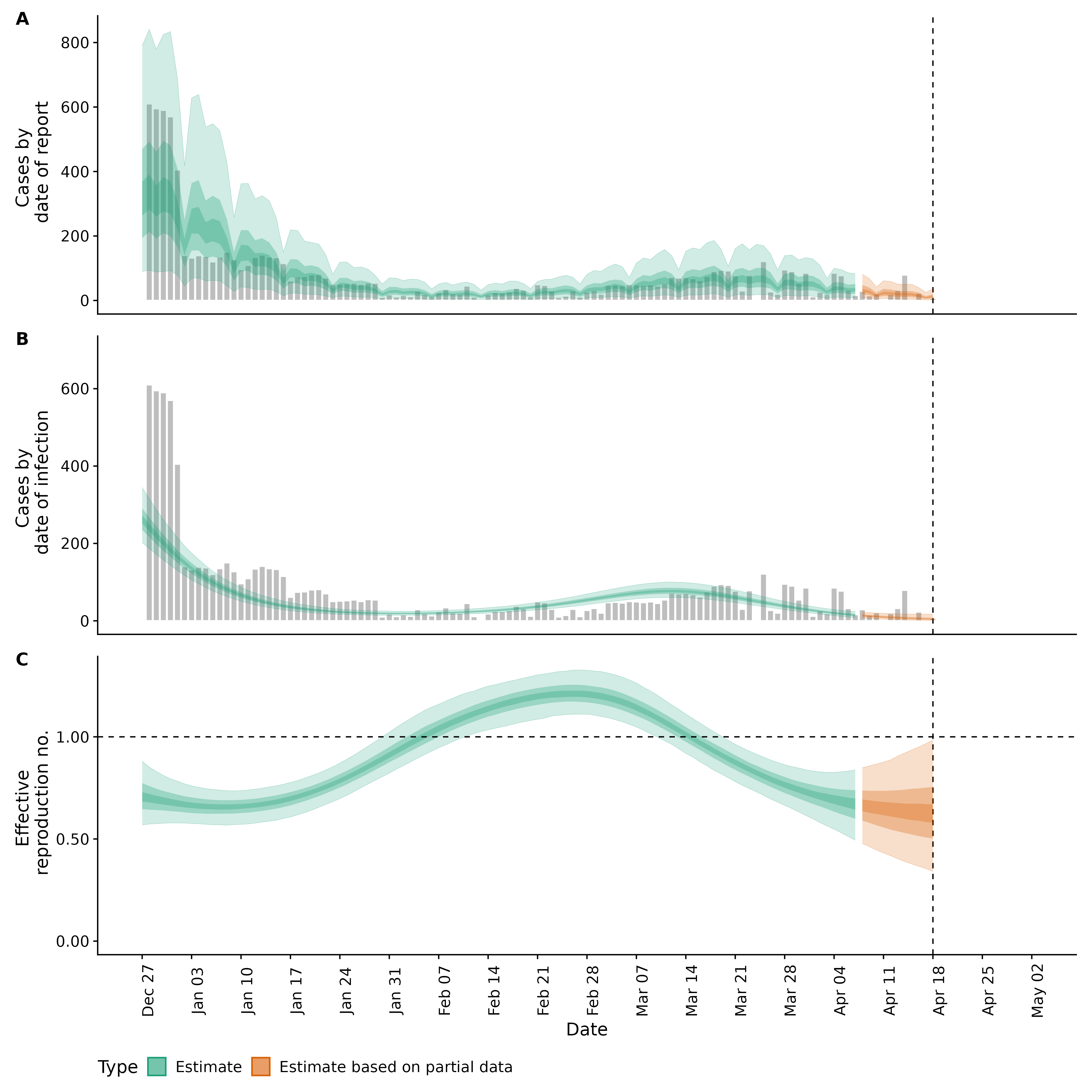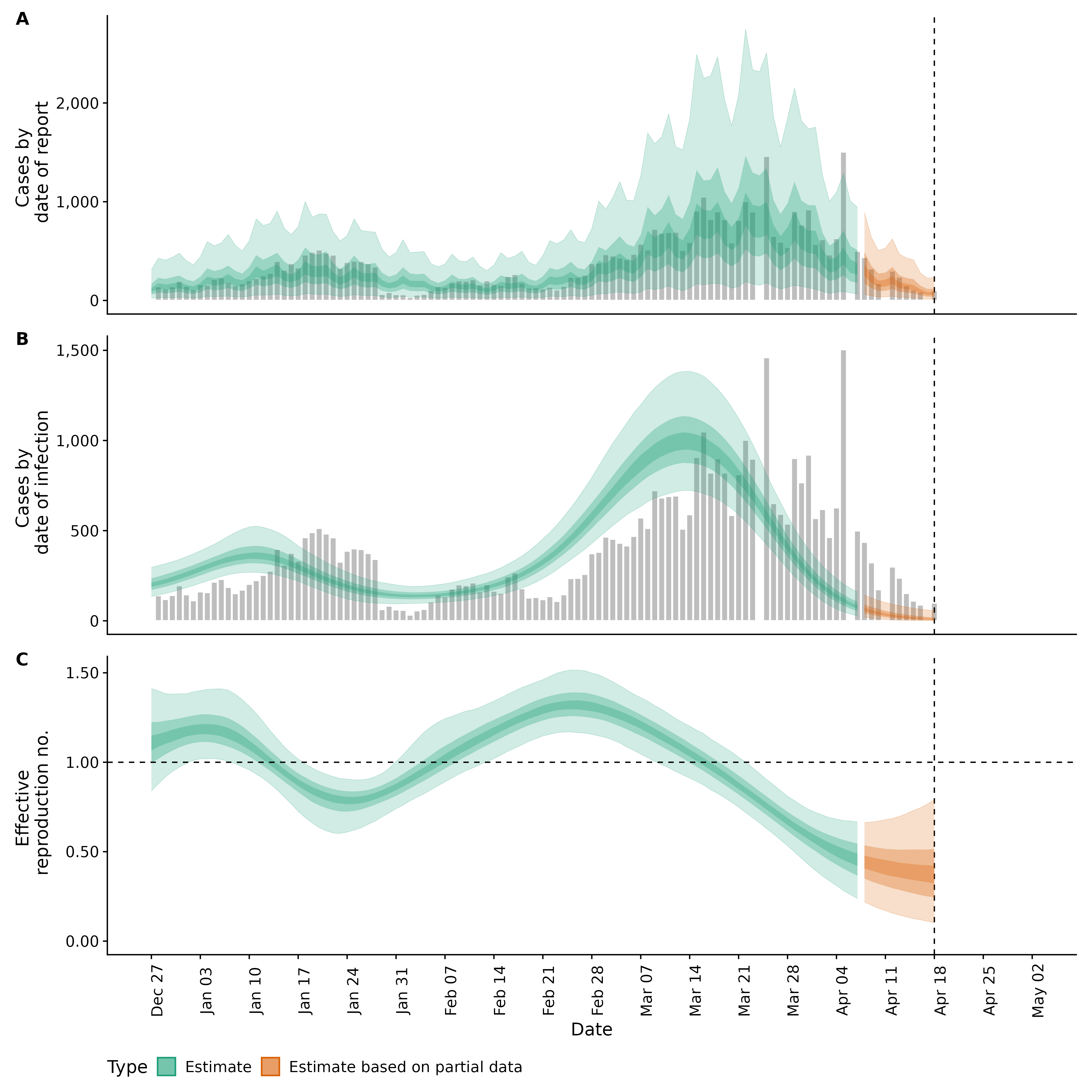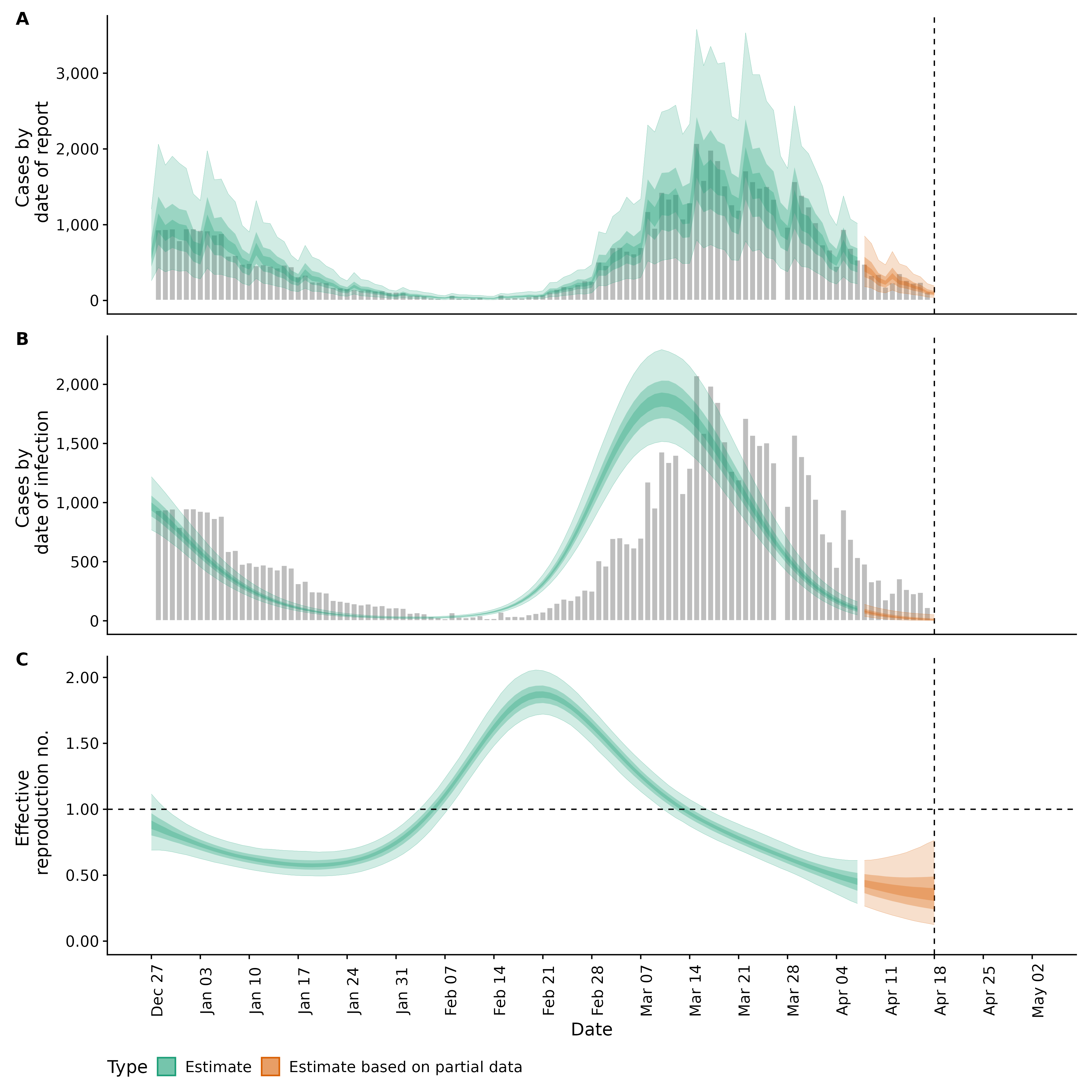 Identifying changes in the reproduction number, rate of spread, and doubling time during the course of the COVID-19 outbreak whilst accounting for potential biases due to delays in case reporting in Backan. These results are impacted by changes in testing effort, increases and decreases in testing effort will increase and decrease reproduction number estimates respectively.